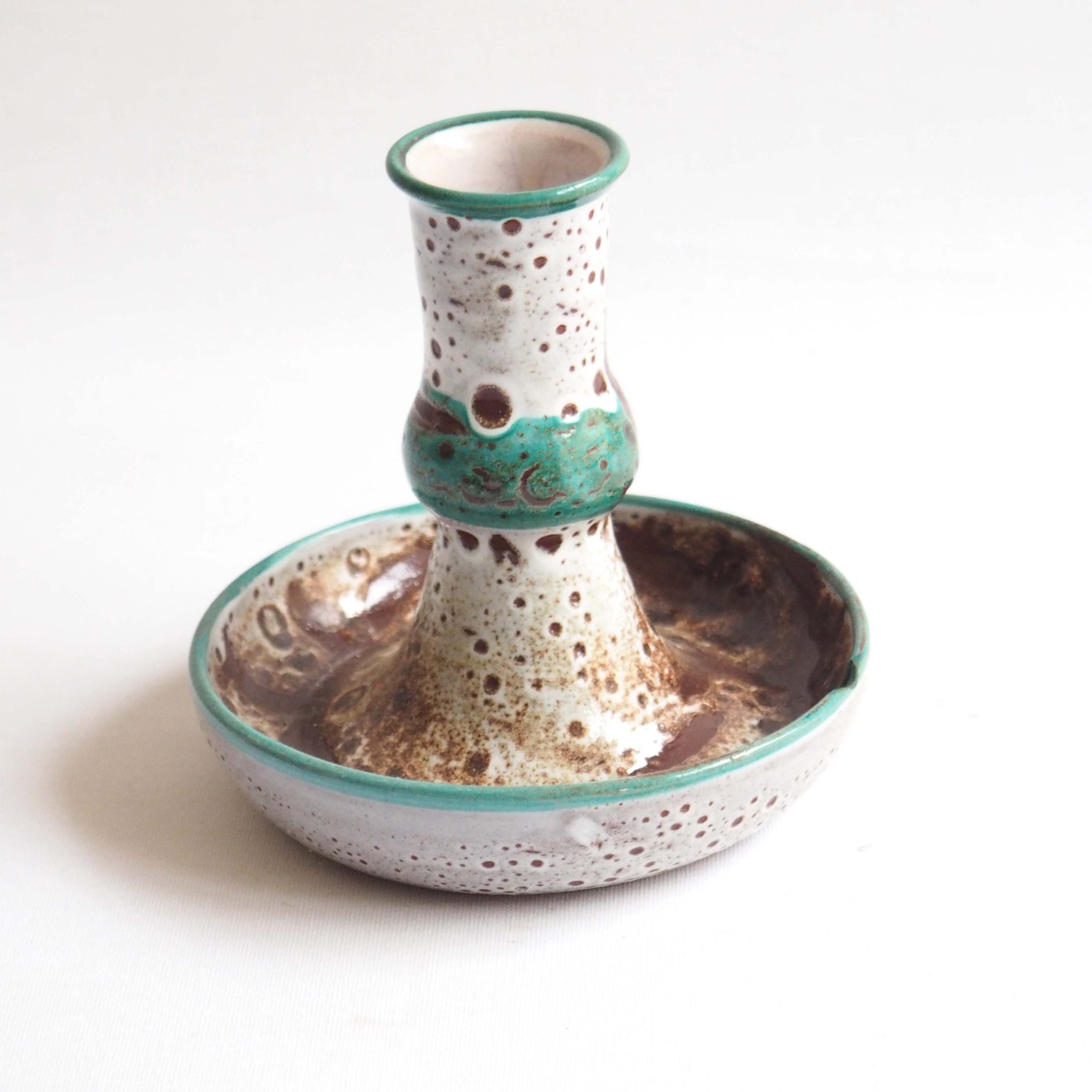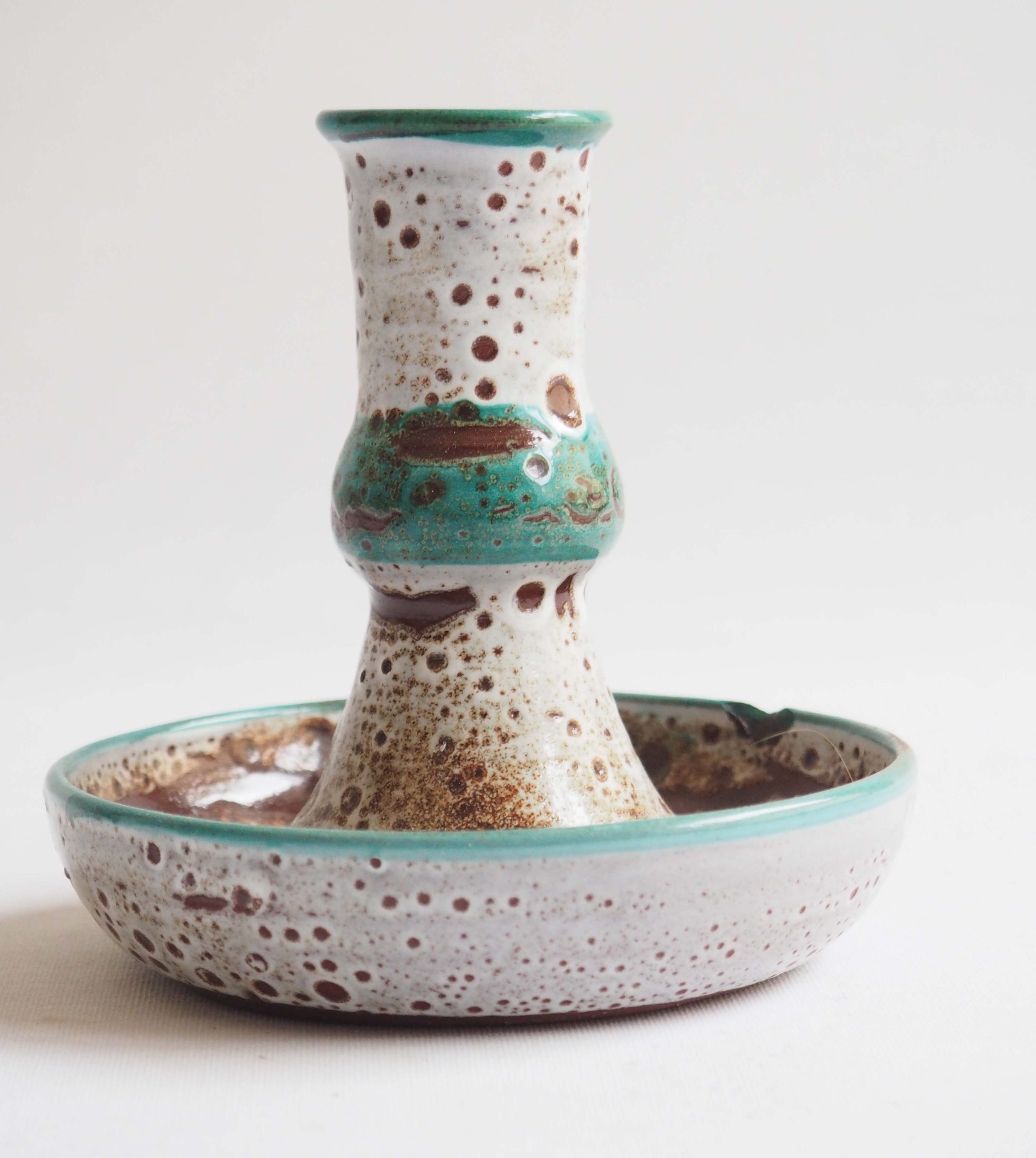 Joli bougeoir en grès rappelant le travail de R. Picault. La mention Vallauris est inscrite. Il donnera une touche authentique et chaleureuse à votre déco. Dimensions: diam. 12 cm, h 12 cm.