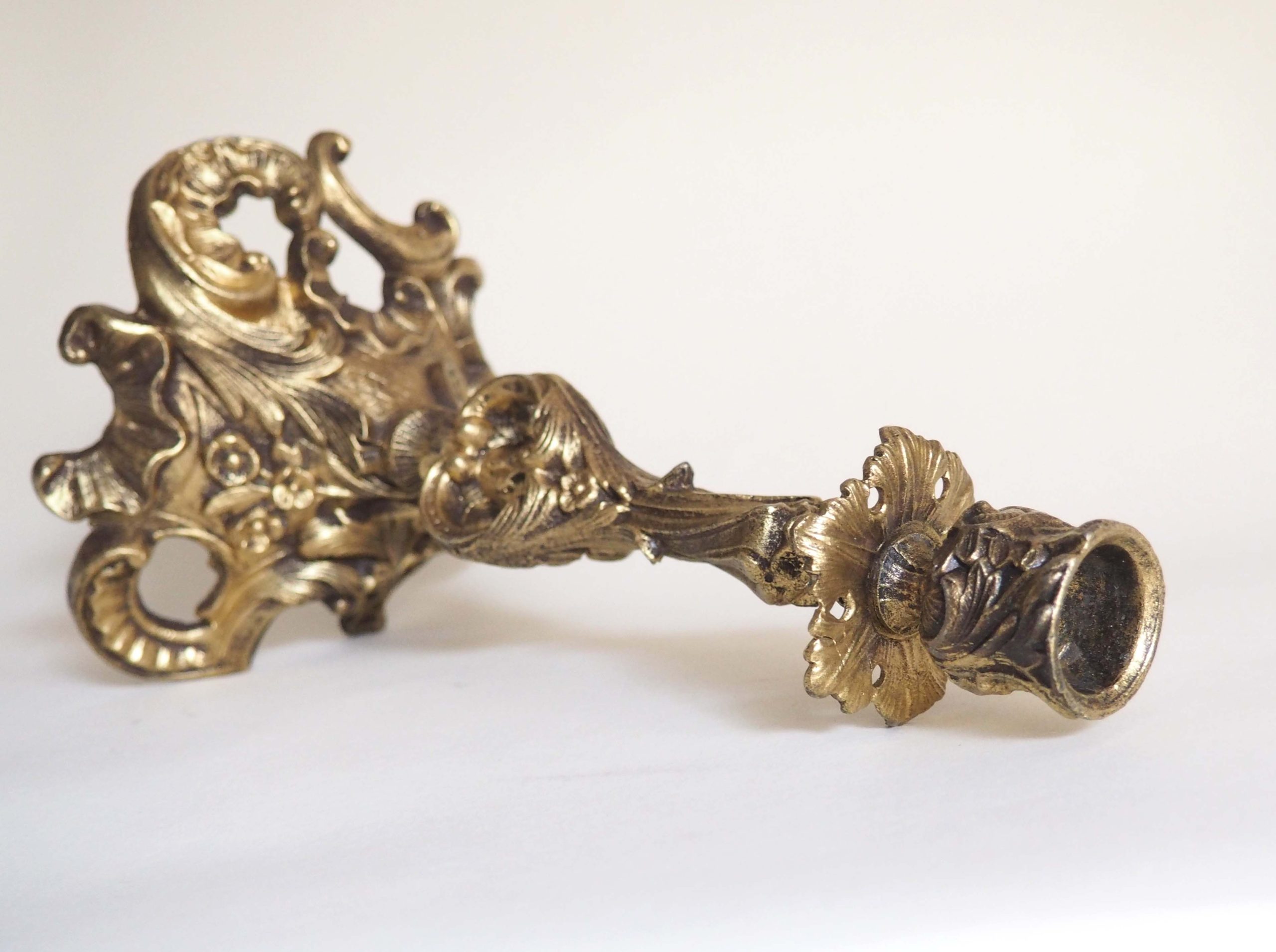 Très beau bougeoir en bronze massif, très travaillé, dans le style rocaille. Il donnera une touche authentique et chic à votre table ou votre déco, excellent état. Dimensions: 24, 5 cm, diam base 14 cm.