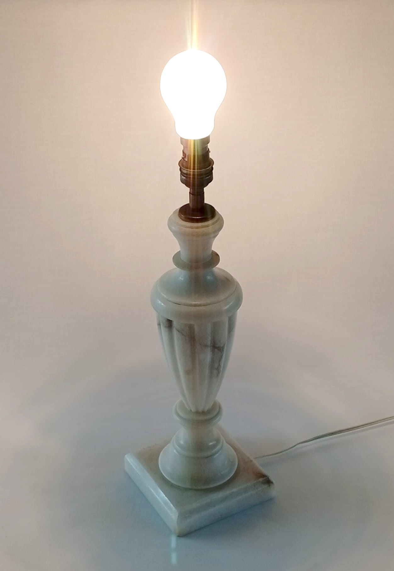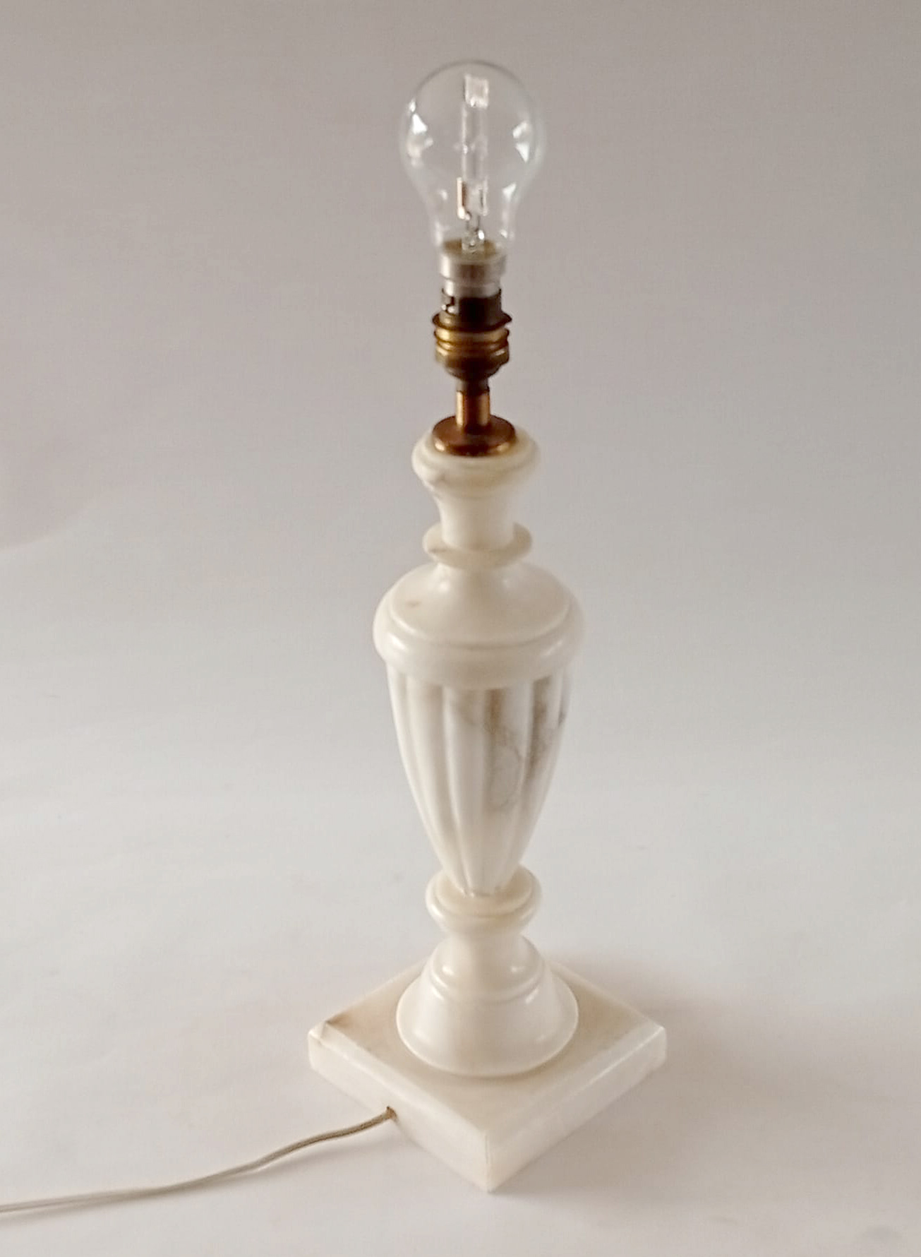 Grand pied de lampe en marbre, forme néoclassique. Fin et délicat, il donnera une touche authentique et chic avec des matériaux naturels à votre déco. Selon votre envie, l’abat-jour pourra le moderniser ou le mettre en valeur. On peut voir des veinages du marbre sur le pied, il ne s’agit pas de fêle ni de défaut, mais du motif naturel du marbre. En excellent état, bien stable (lourd), fonctionne parfaitement, électricité vérifiée, douille B22 (ampoule fournie, on peut les trouver dans tous les magasins de bricolage / supermarchés dorénavant en led). Dimensions: h 35 cm, base : 12 x 12 cm.
