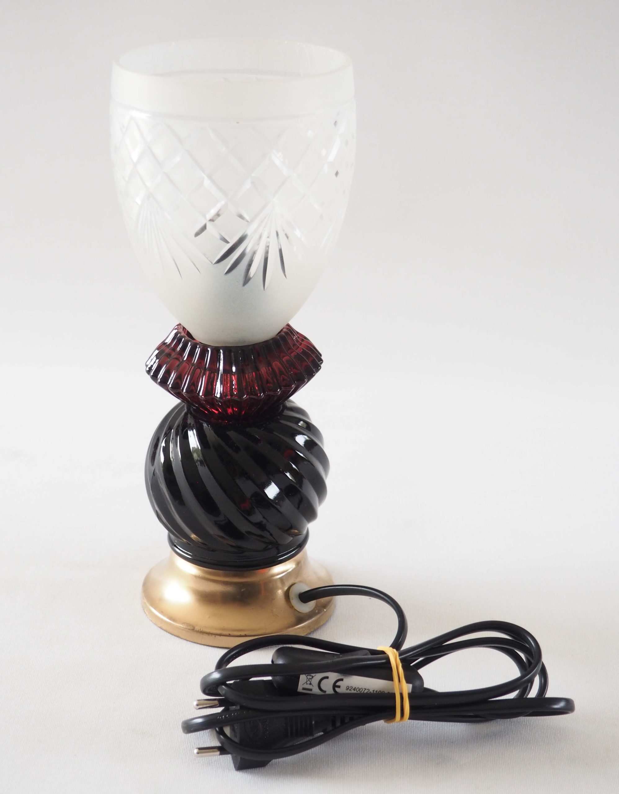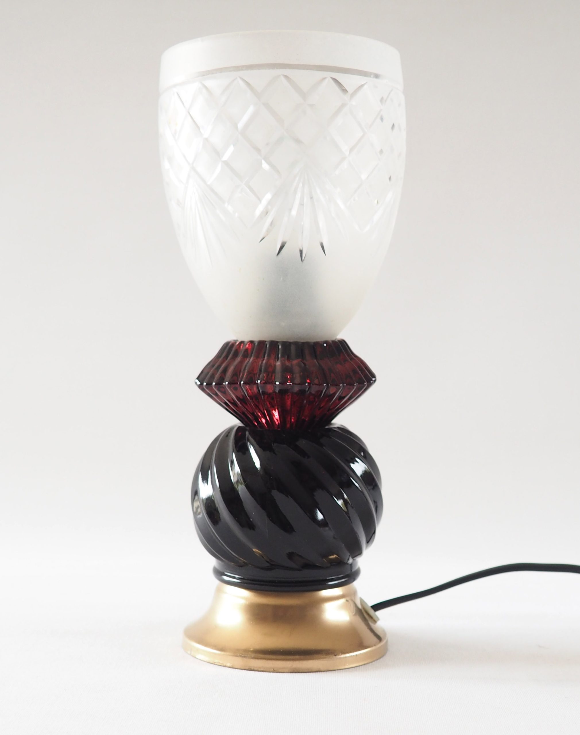 Lampe composée d’une verrerie art déco en cristal taillé et satiné, de deux bagues en verre teinté dans la masse d’un beau rouge profond, presque couleur aubergine, et base en métal doré. Parfaite en lampe de chevet ou d’ambiance, elle donnera une touche chic et unique à votre intérieur. Assemblée à partir d’éléments de lustrerie art déco et anciens upcyclés, il ne peut y avoir deux modèles identiques, et évidemment toute la partie électrique est neuve ! Fonctionne parfaitement, douille à vis. Dimensions: h 25 cm, diamètre base 9 cm.