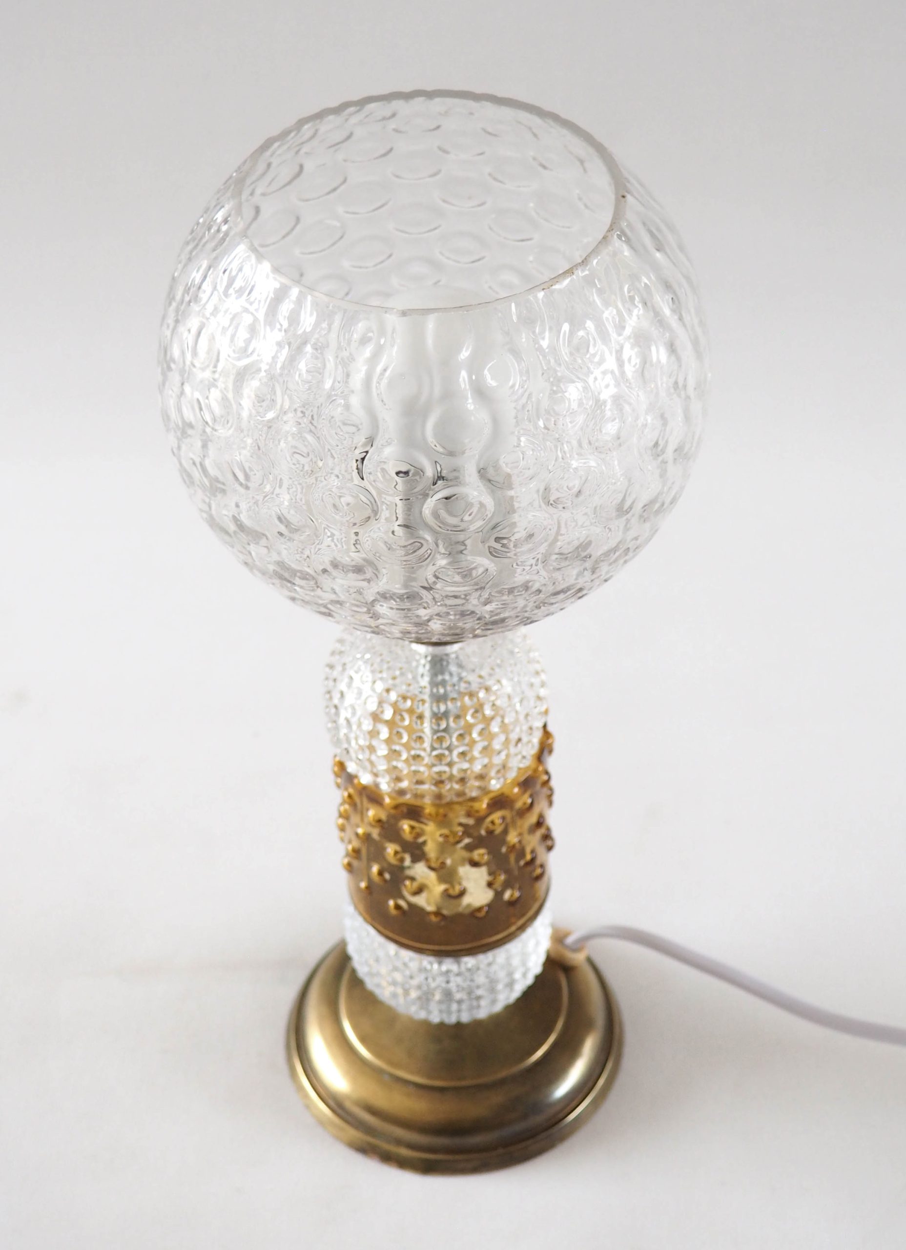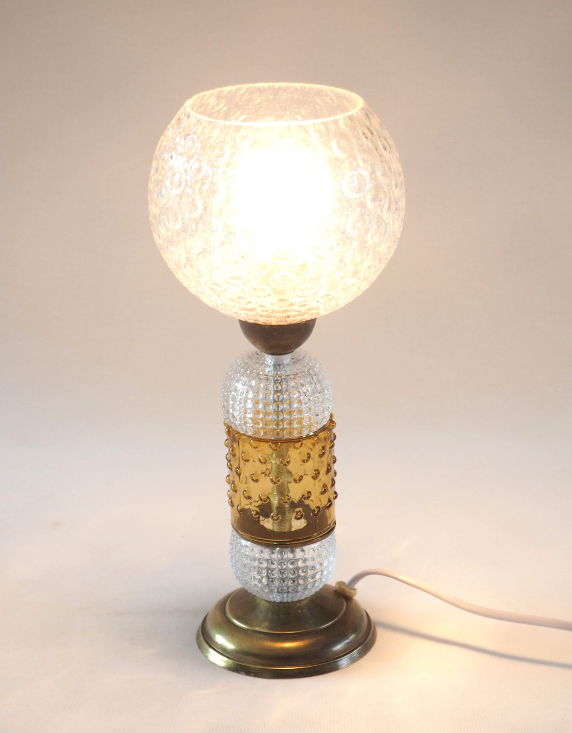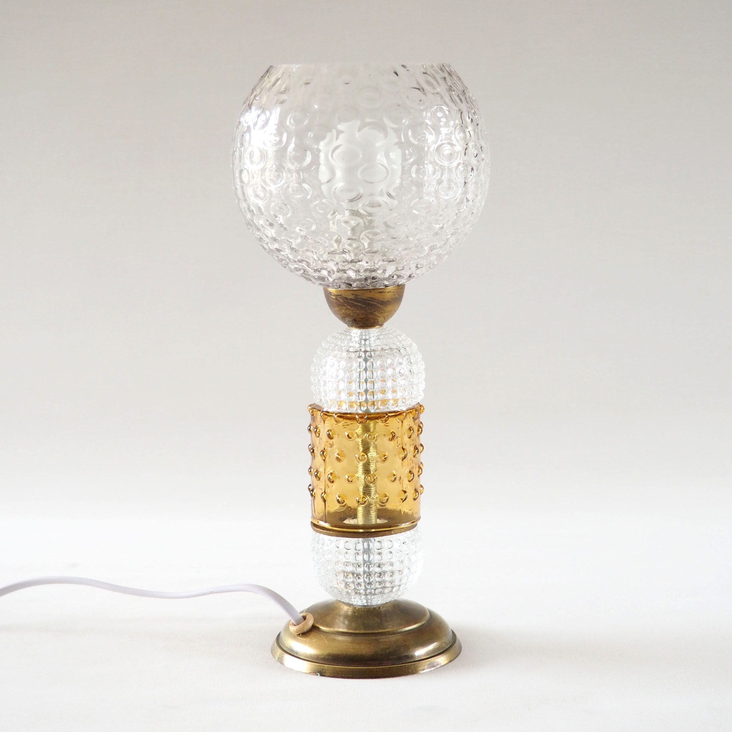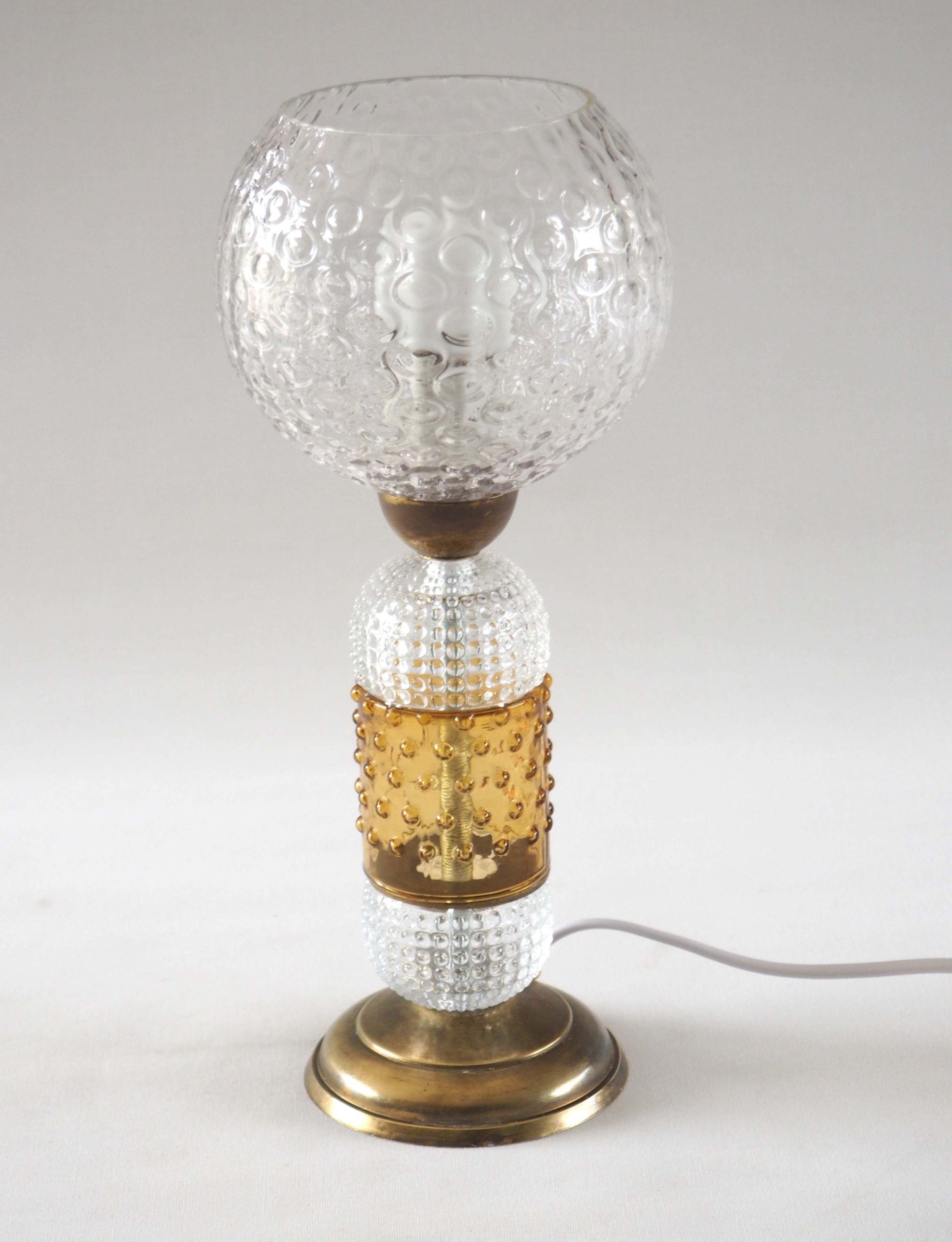 Lampe composée d’une verrerie à bulles, de bagues en verre bullé et teinté ambre, base et éléments de liaison en métal doré. Parfaite en lampe de chevet ou d’ambiance, elle donnera une touche de transparence unique à votre intérieur. Assemblée à partir d’éléments de lustrerie art déco et anciens upcyclés, il ne peut y avoir deux modèles identiques, et évidemment toute la partie électrique est neuve ! Fonctionne parfaitement, douille à vis. Dimensions: h 30 cm, diamètre base 9 cm.