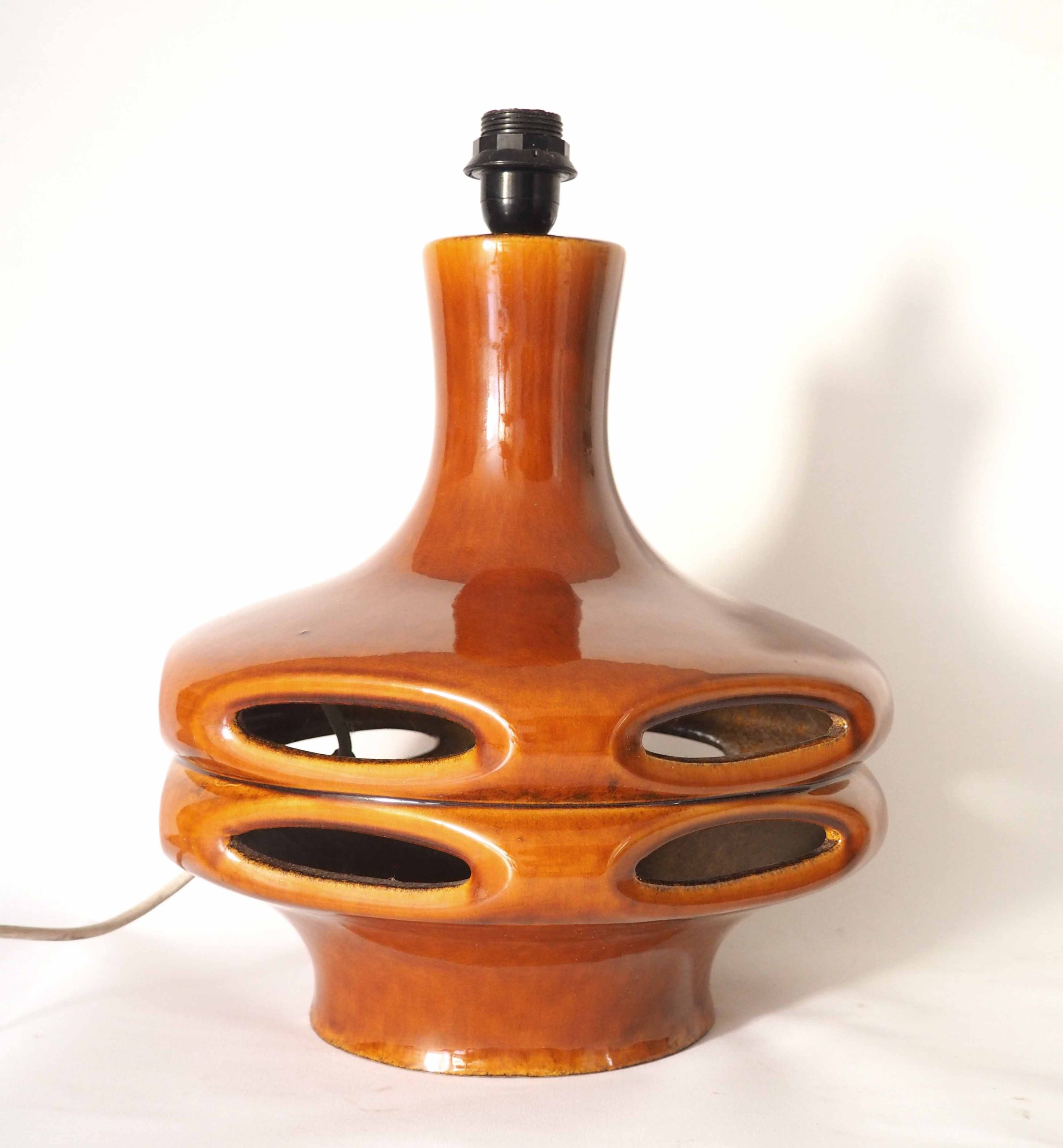 Lampe de table à corps ajouré en céramique émaillée ocre-brun. Stein keramik germany. Circa 1970. 2 sources de lumière, une douille à l’intérieur pour un effet de lumière rasant le sol ou le support sur lequel elle est posée. H: 45 cm – l: 33 cm.