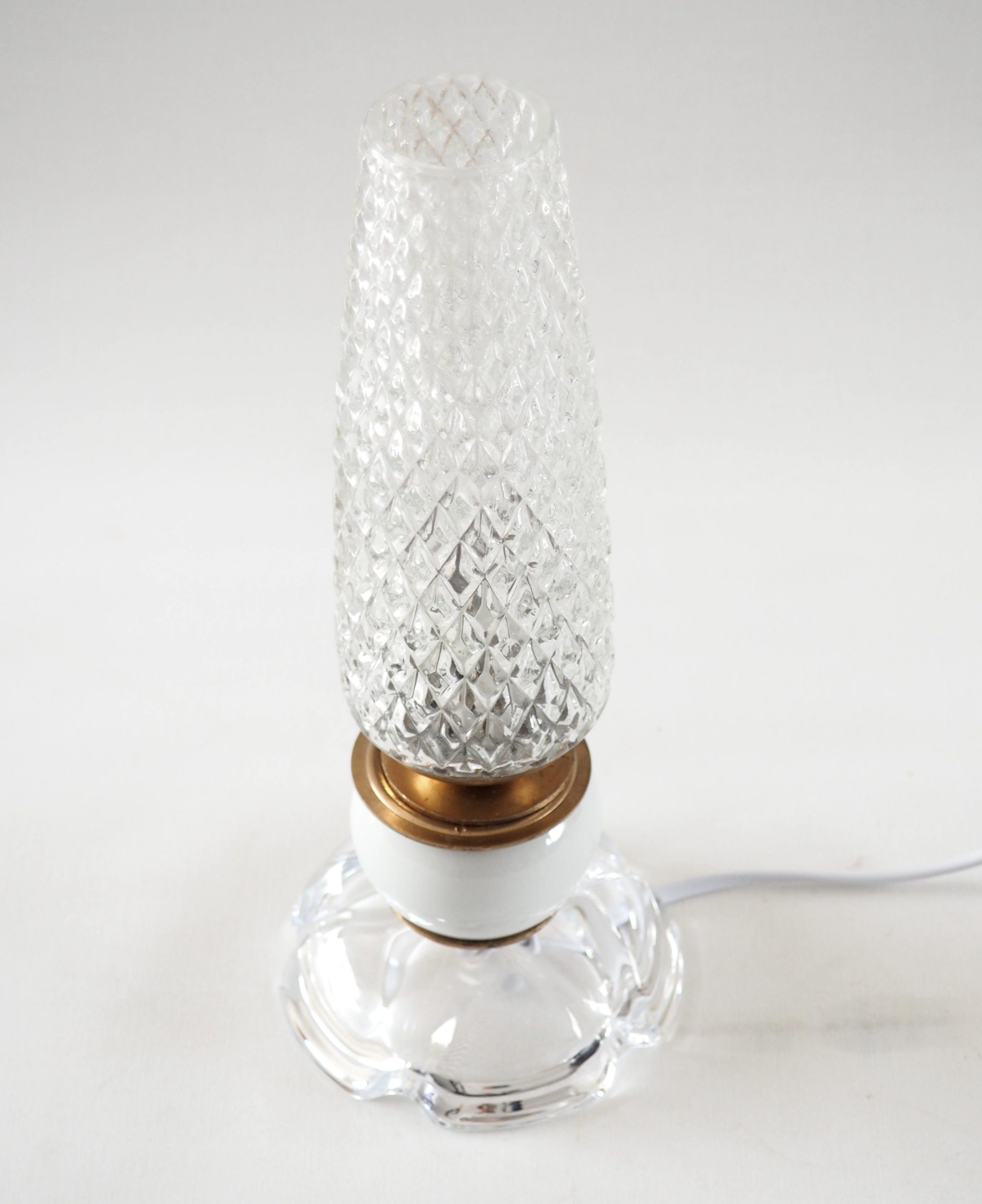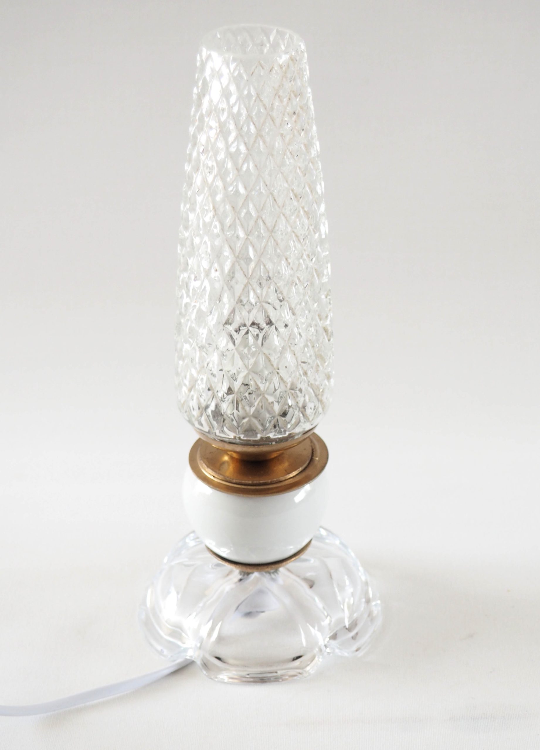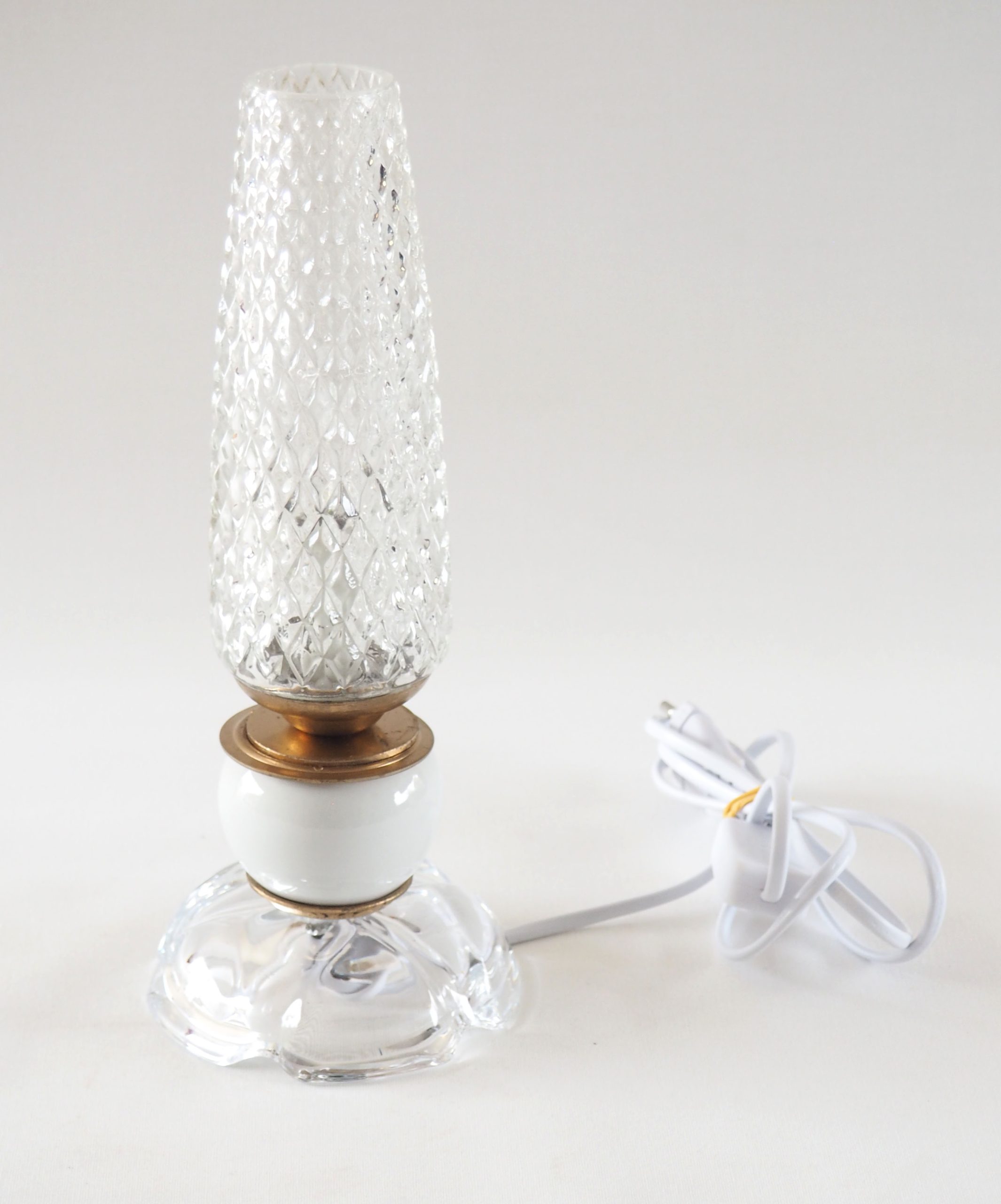 Lampe composée d’une flute ancienne en verre moulé en relief, d’une bague boule en céramique blanche, base en verre, et d’éléments de liaison en métal doré. Parfaite en lampe de chevet ou d’ambiance, elle donnera une touche authentique et unique à votre intérieur. Assemblée à partir d’éléments de lustrerie et objets vintage upcyclés, il ne peut y avoir deux modèles identiques. Biensur l’électricité est neuve. Fonctionne parfaitement, douille à vis. Dimensions: h 28 cm, diamètre base 8 cm.