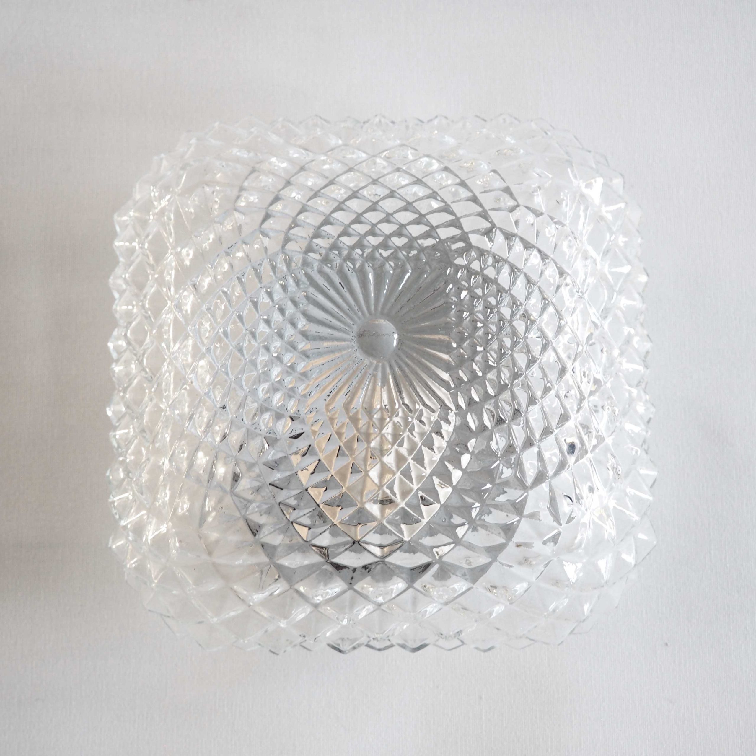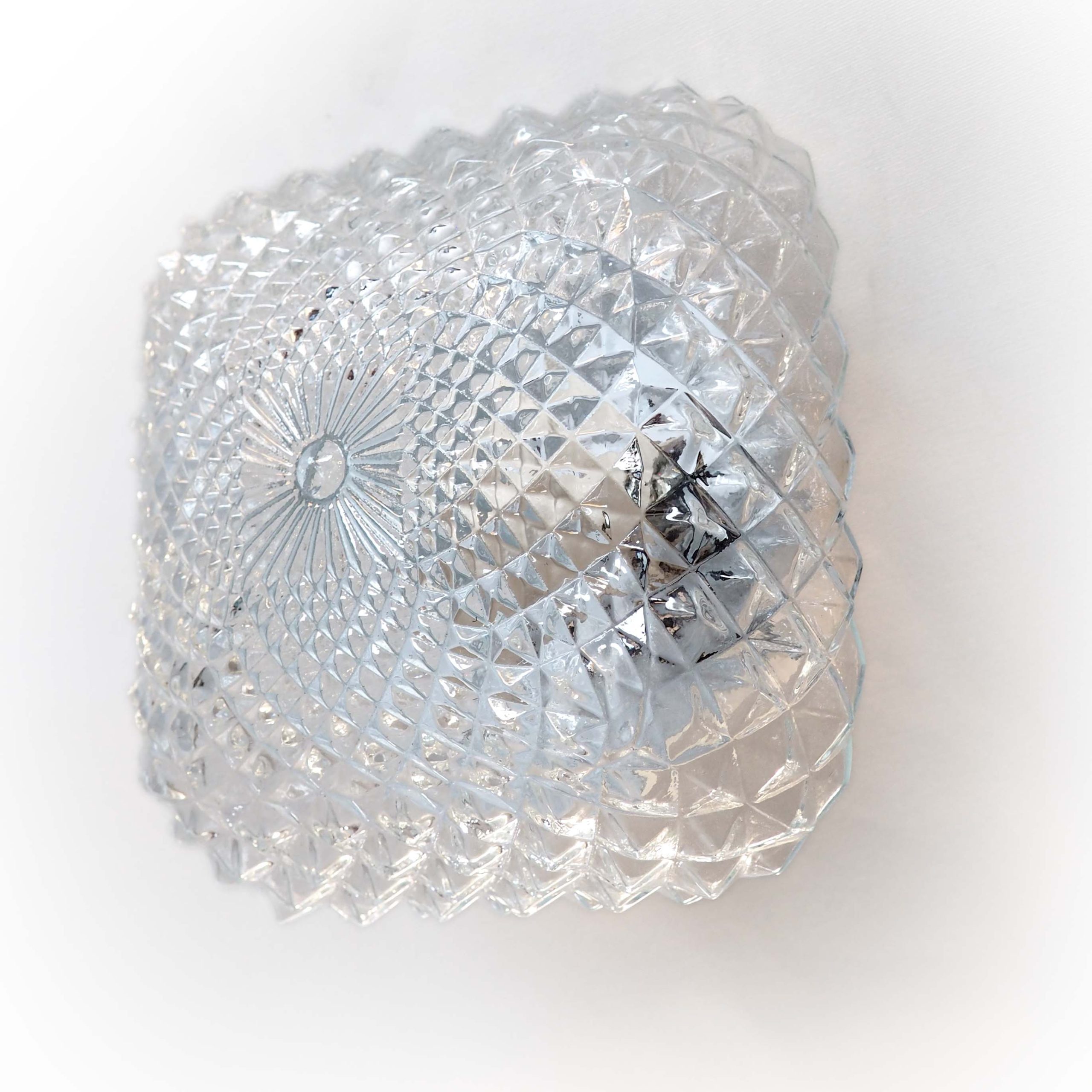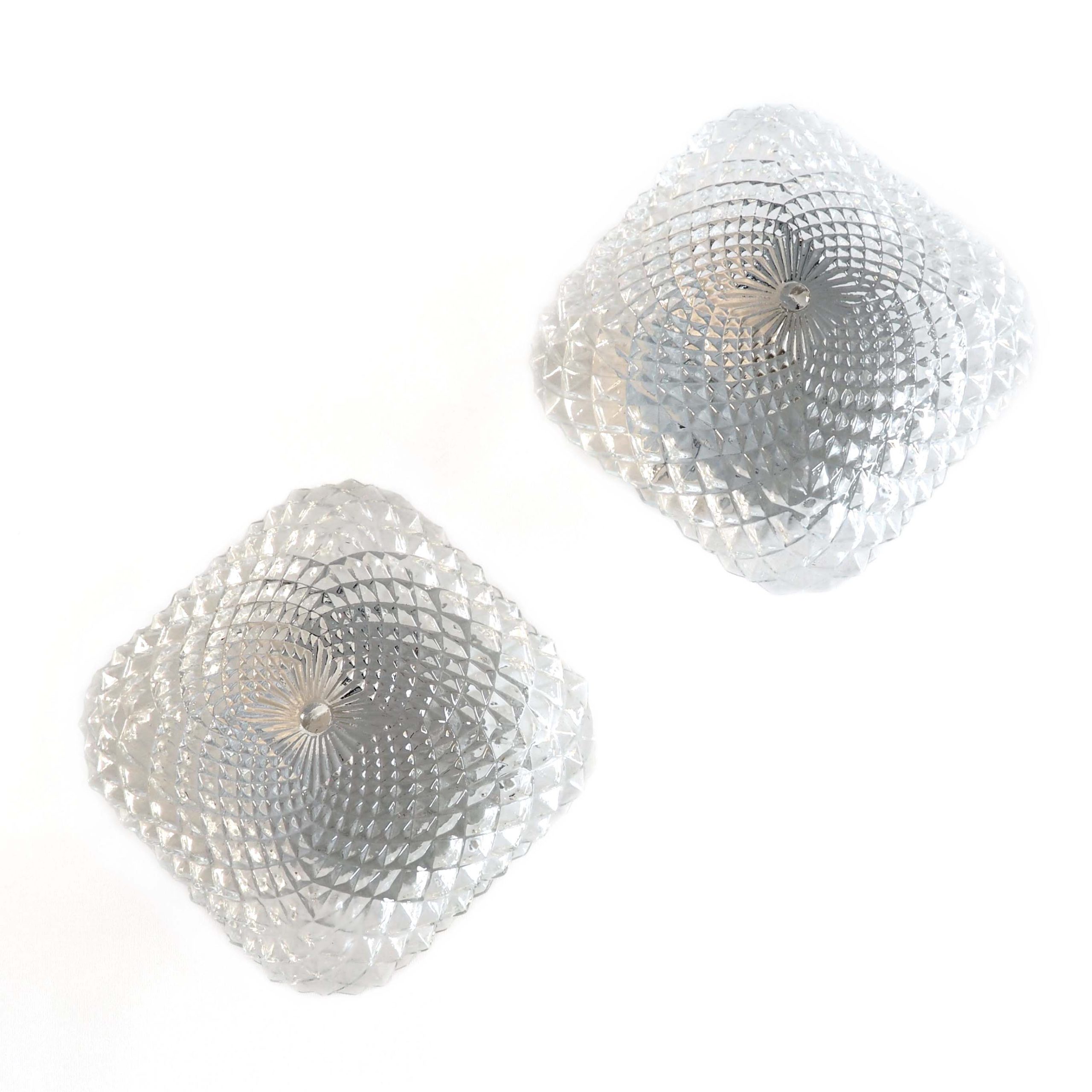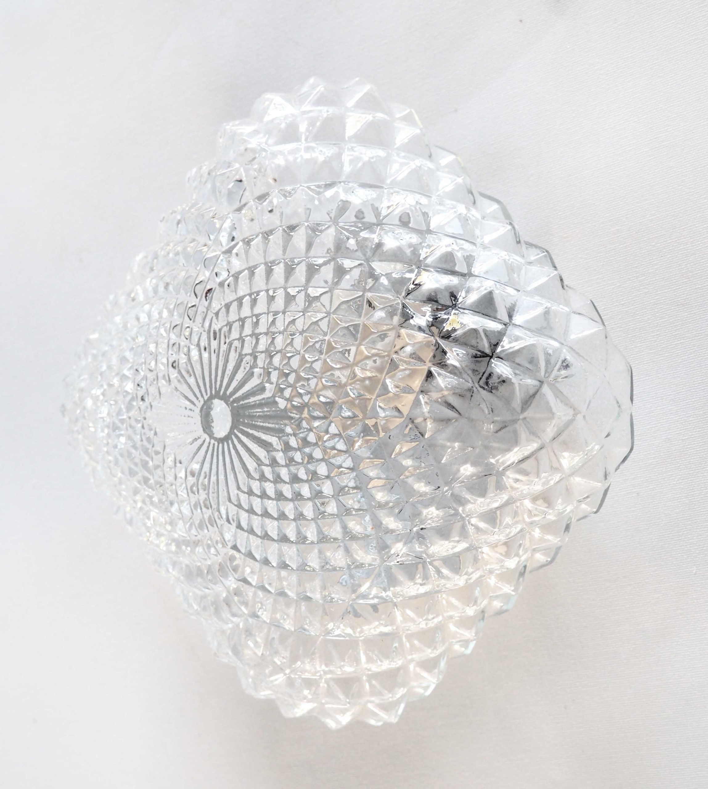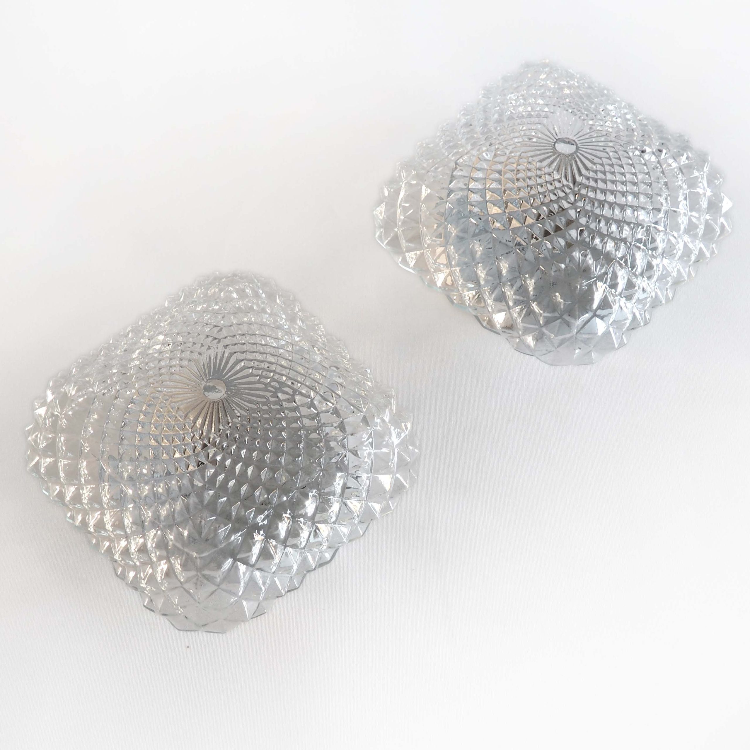 Paire d’appliques plafonniers carrées modèle bombé pointes en spirale, en verre épais moulé, jolis effets de lumière sur les murs. Elles donneront une touche authentique et unique à votre déco. Parfait au dessus d’un plan de travail, d’un bureau, une entrée, un couloir, … ou pour donner du relief à un mur de cadres et miroirs. Elles fonctionnent parfaitement, douille à vis. Dimensions: p 11 cm, coté 18 cm.