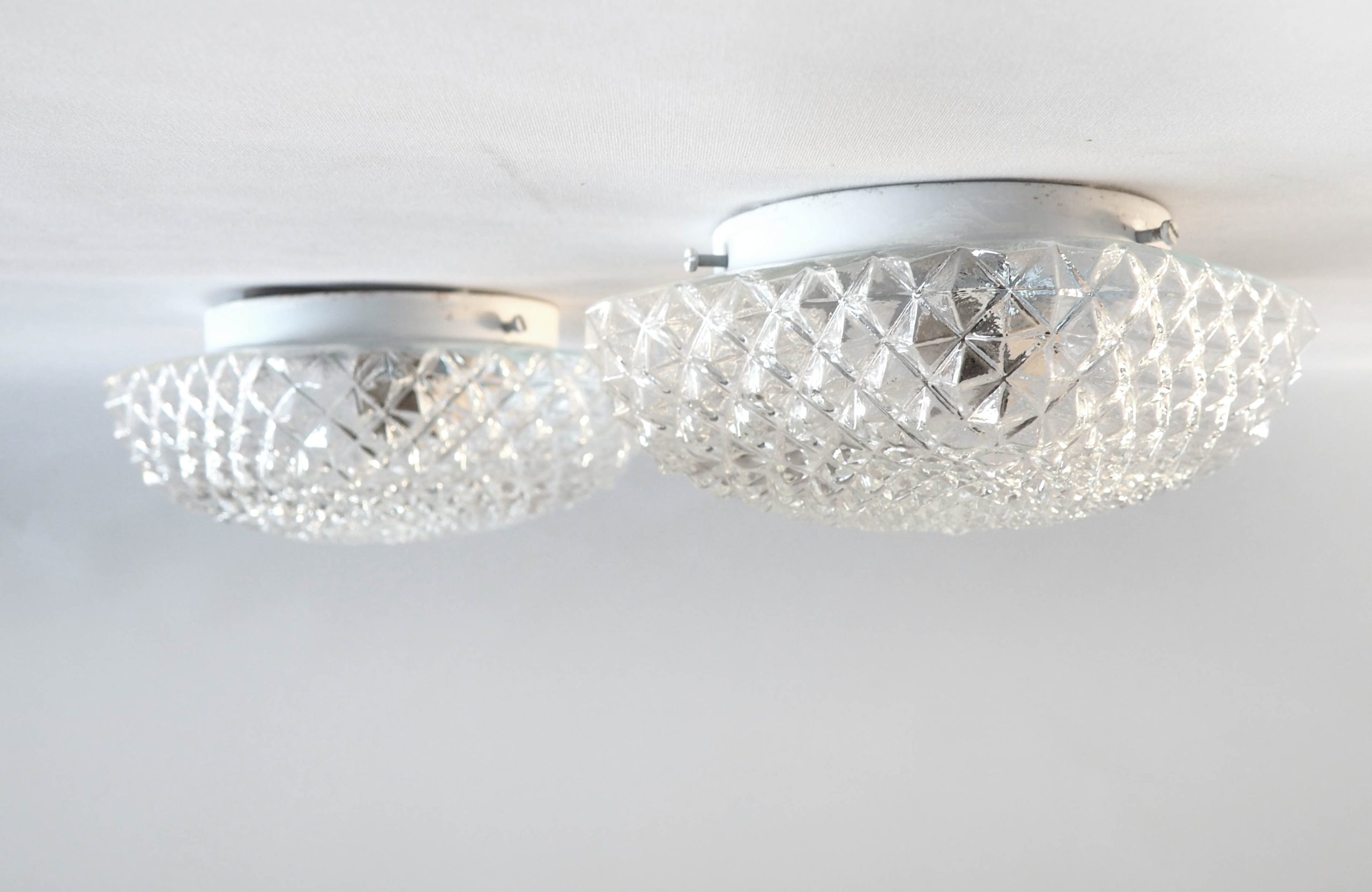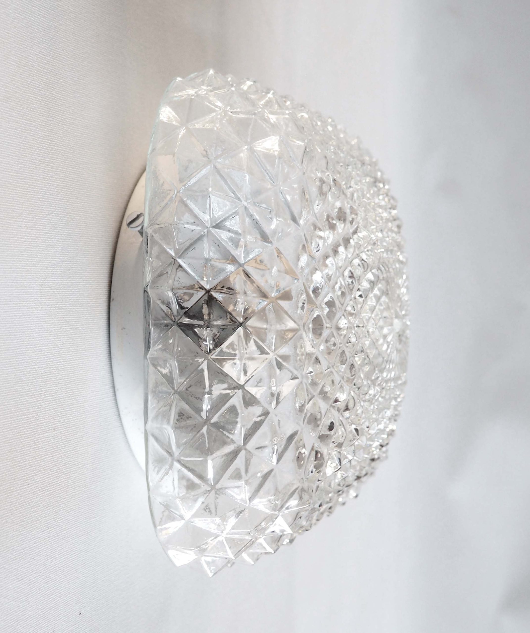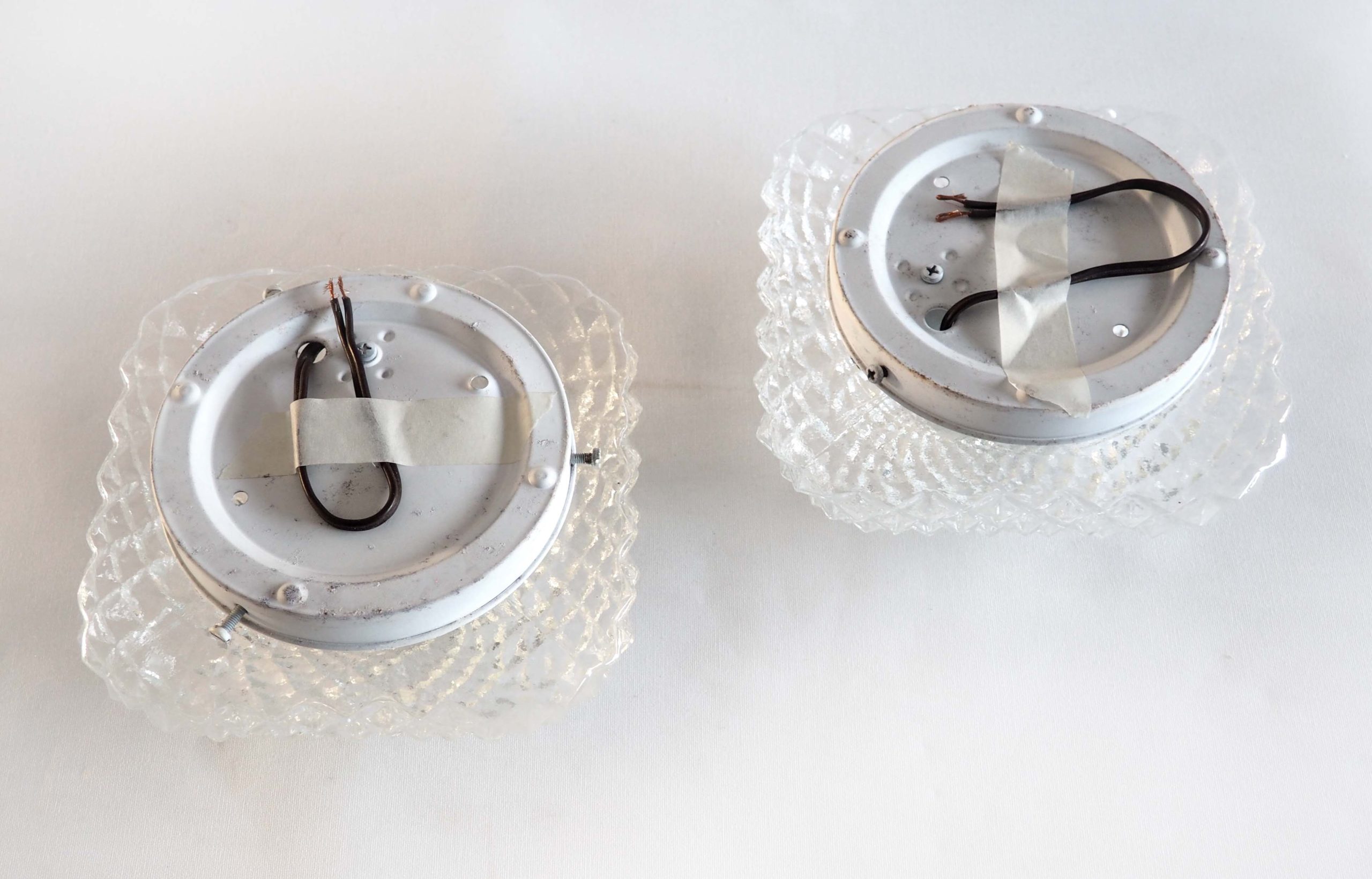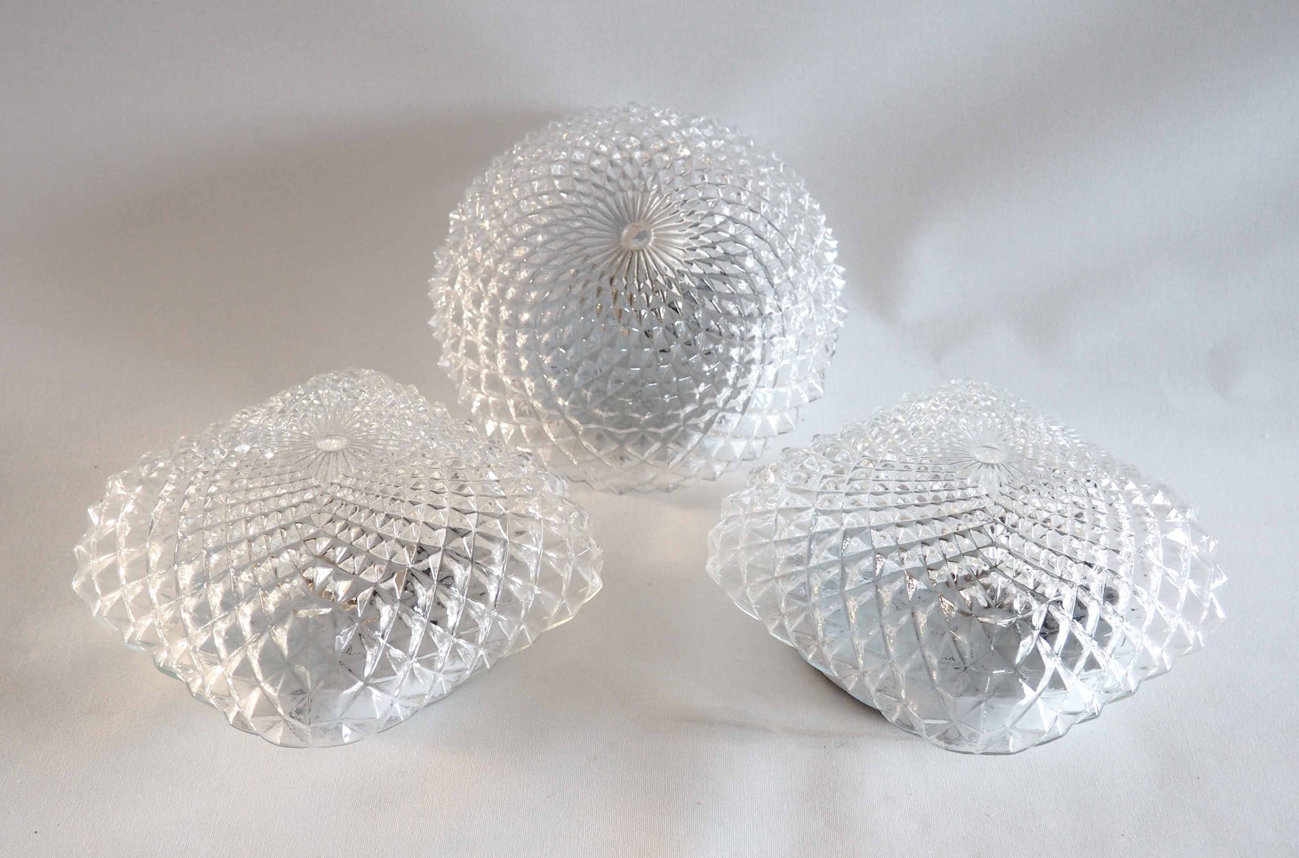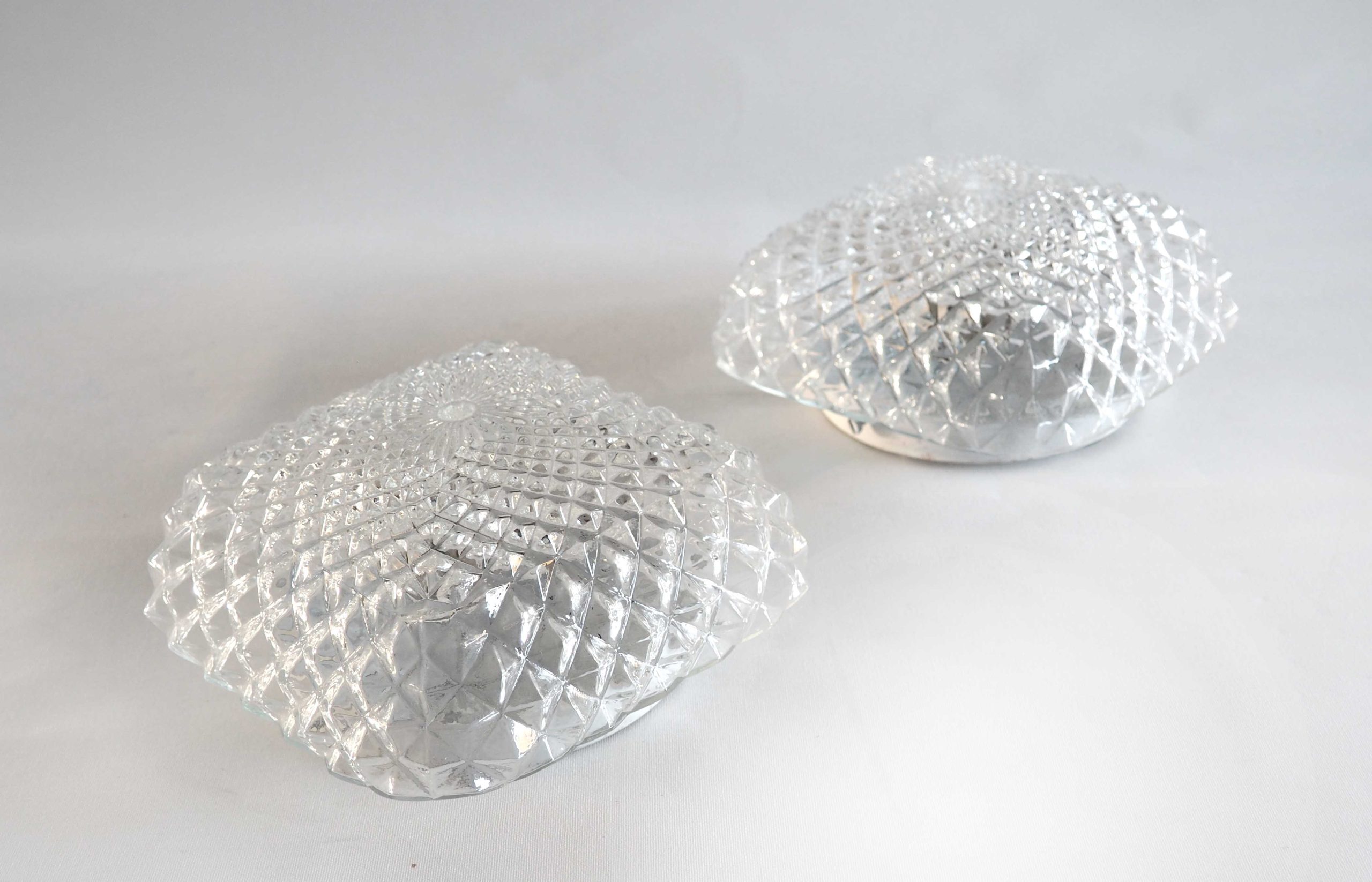 Paire d’appliques plafonniers carrées modèle bombé pointes en spirale, en verre épais moulé, jolis effets de lumière sur les murs. Elles donneront une touche authentique et unique à votre déco. Parfait au dessus d’un plan de travail, d’un bureau, une entrée, un couloir, … ou pour donner du relief à un mur de cadres et miroirs. Elles fonctionnent parfaitement, douille à vis. Dimensions: p 11 cm, coté 18 cm.