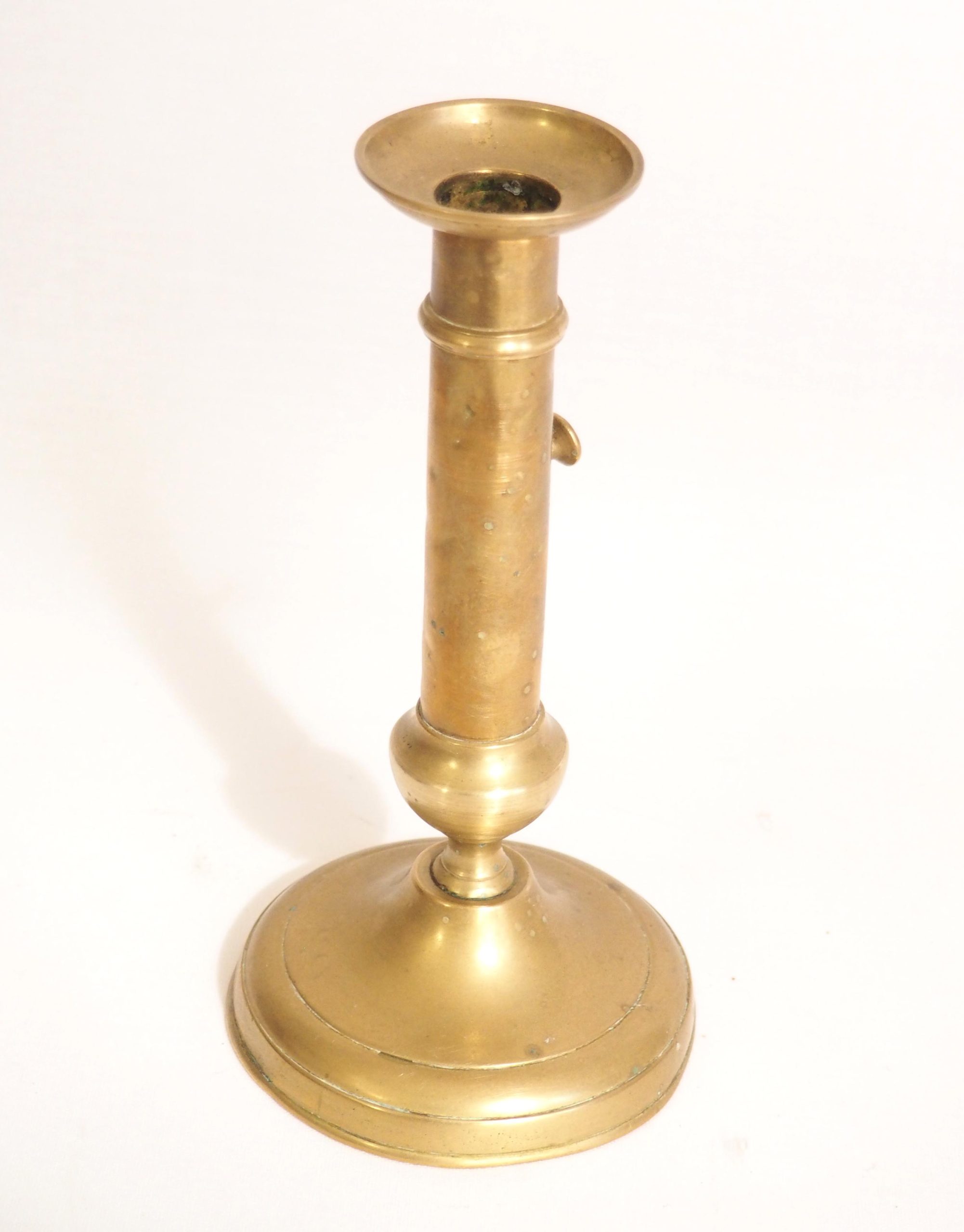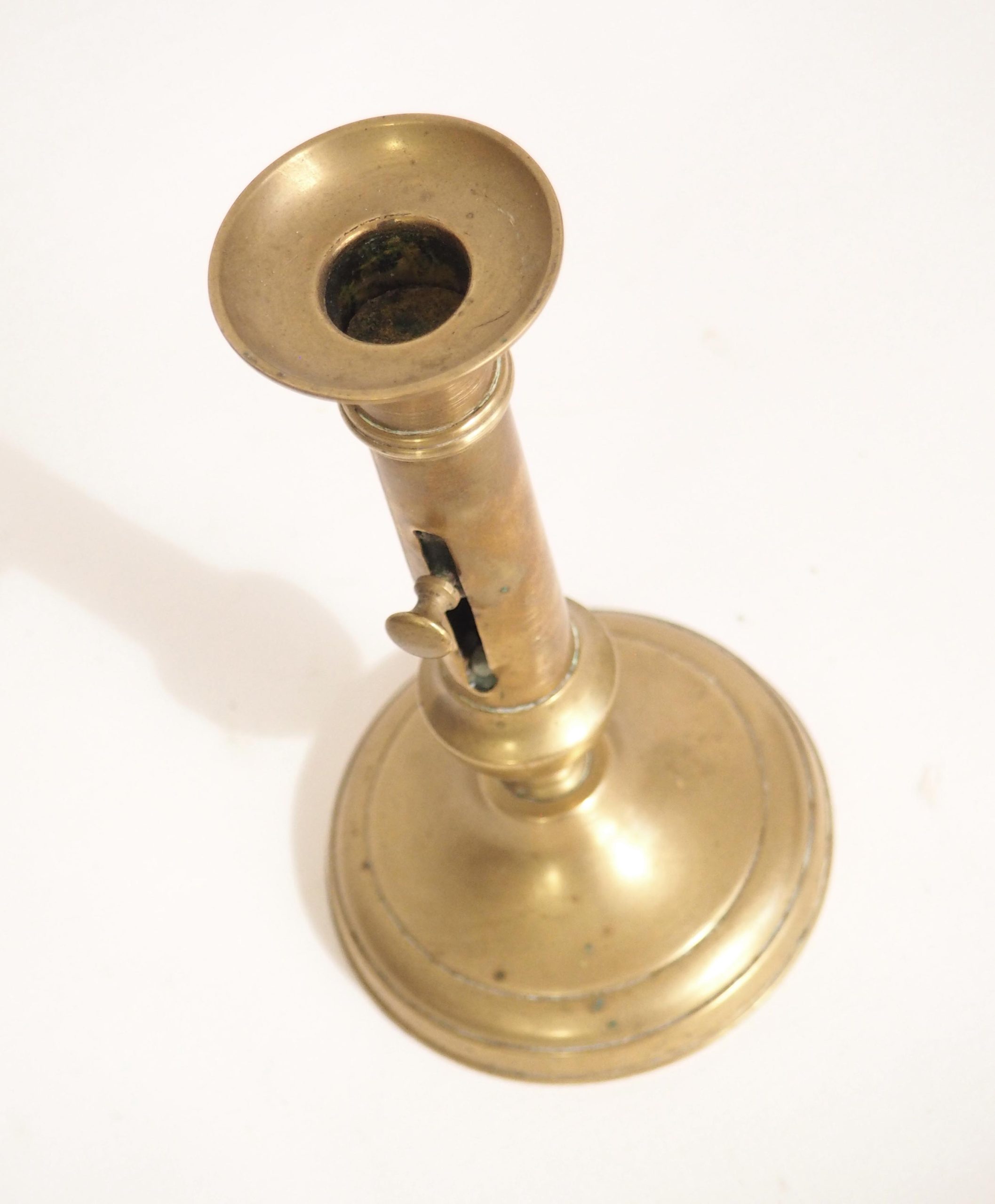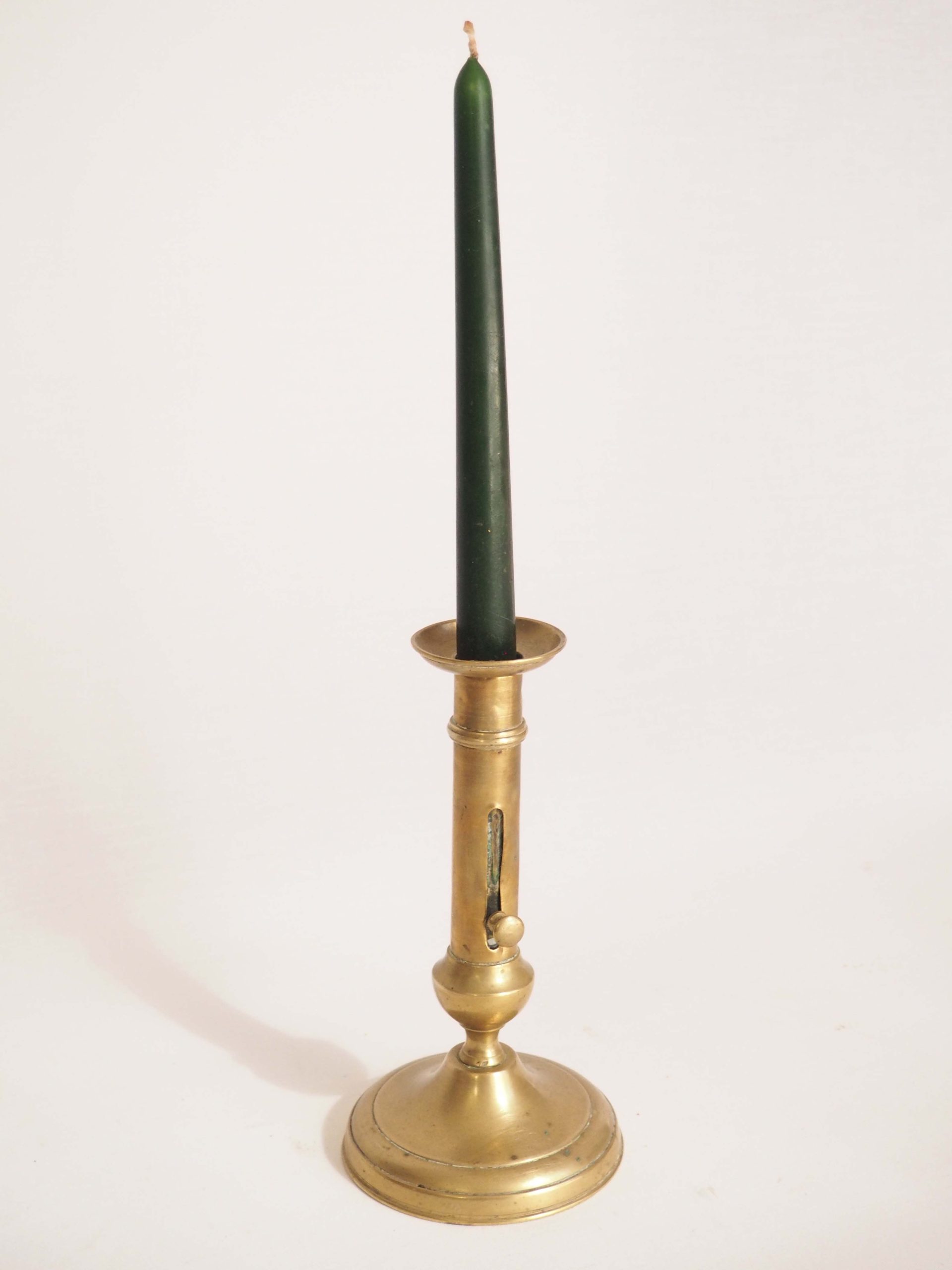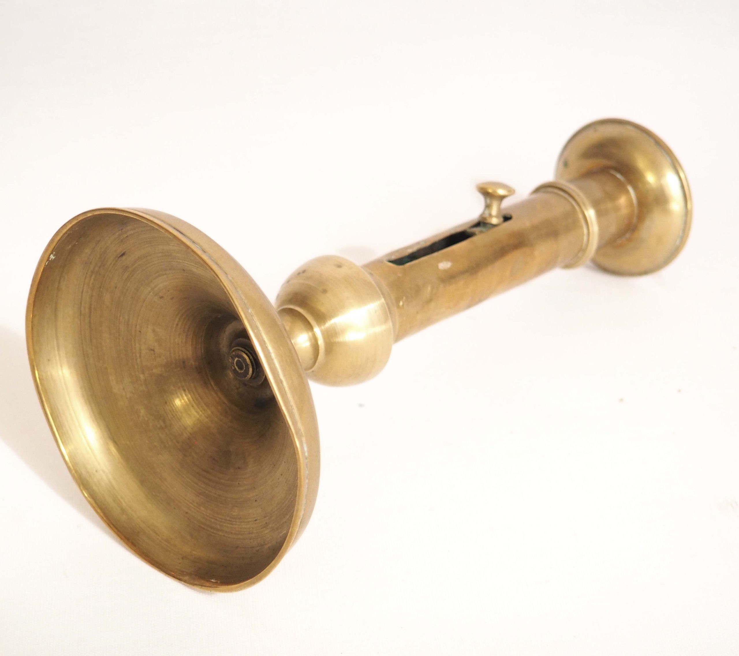 Paire de bougeoirs en laiton, forme tube à bobèche classique, système pour remonter la bougie. Il donneront une touche authentique et chic à votre table ou votre déco. En bon état, traces d’usages visibles sur les photos. Dimensions: H 21 cm, diamètre base 10,5 cm.