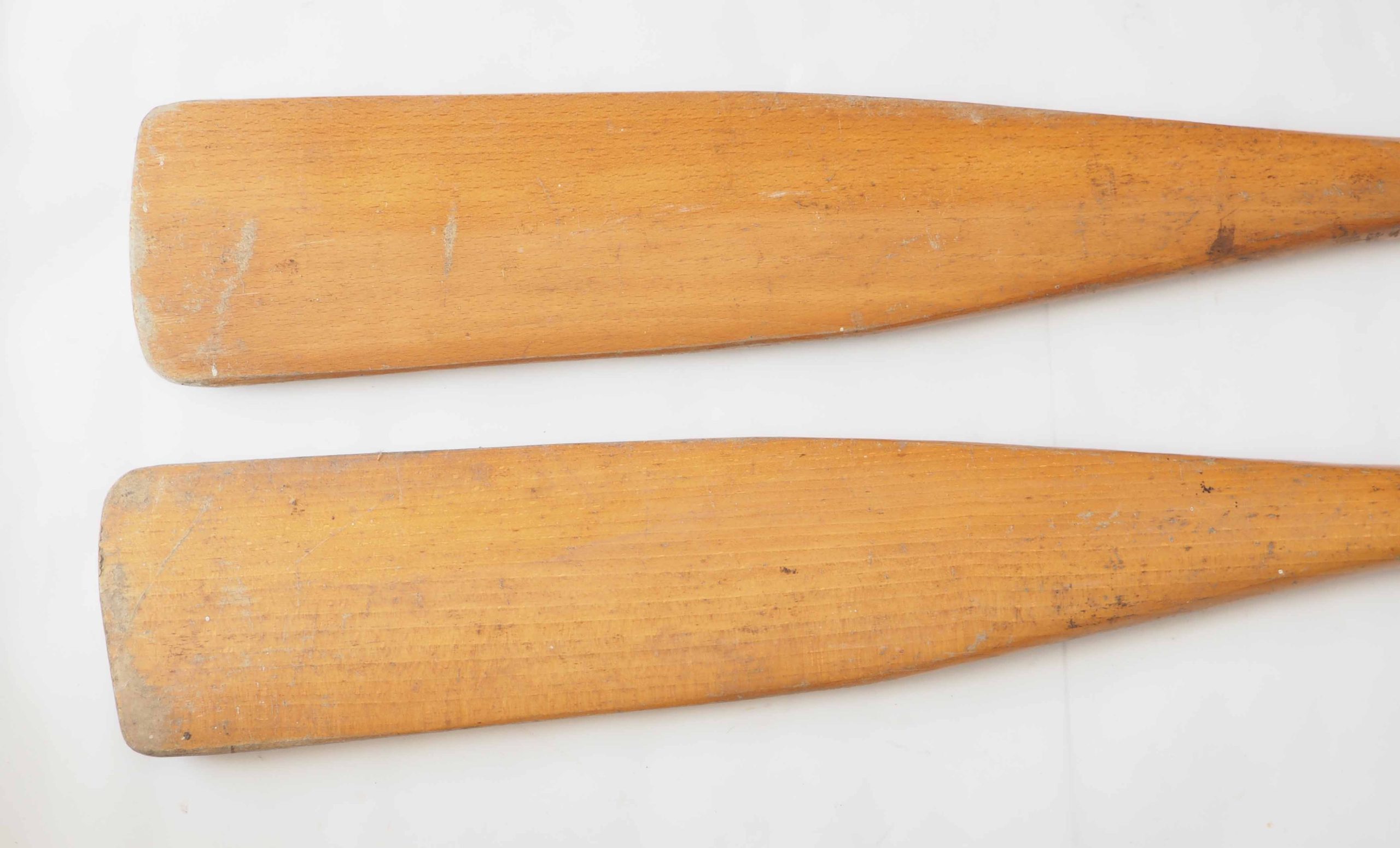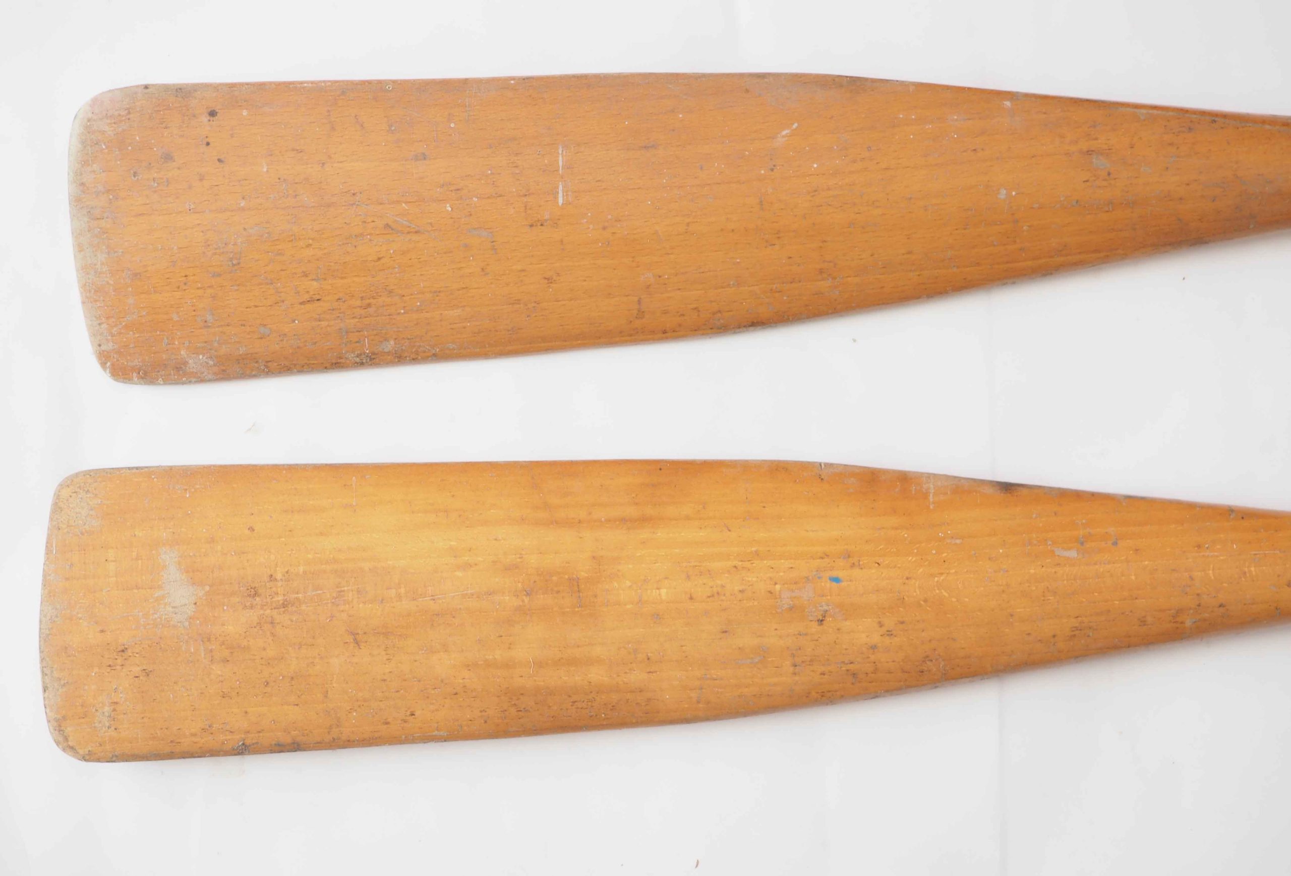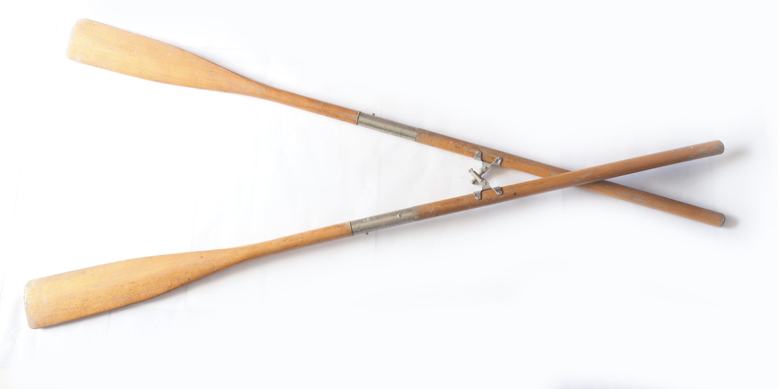 Paire de rames / pagaies anciennes en bois et fixations métal. Beau modèle de grande taille. Installées croisées au mur ou simplement posées verticalement au coin d’une pièce, elles donneront une touche authentique, un esprit sport vintage et maison de bord de mer à votre décor. Dimensions: l 161 cm, partie rame plus large: 11 X 50 cm.