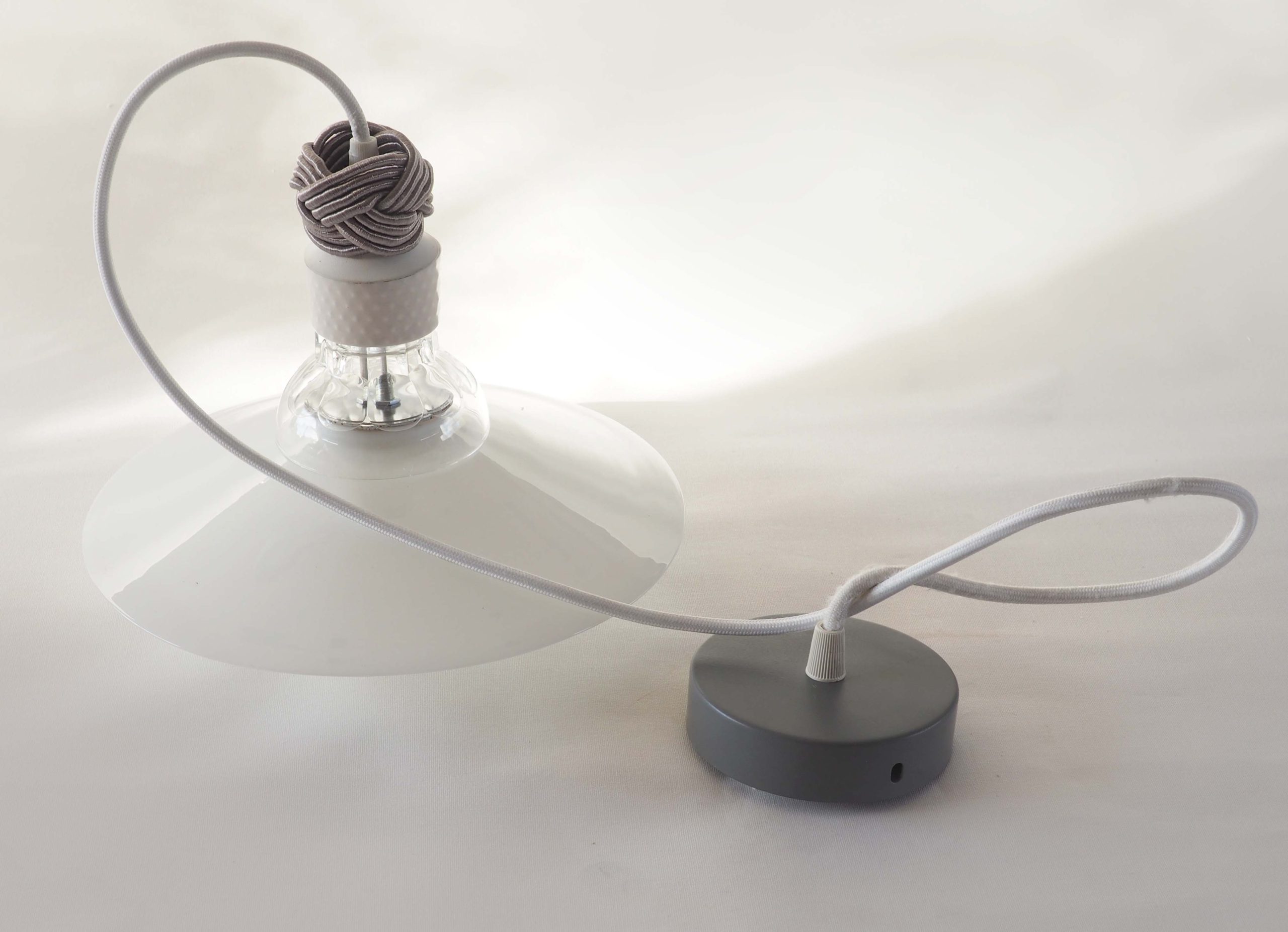 Suspension composée d’une verrerie opaline fine, d’une verrerie très ancienne en forme de fleur satinée, et éléments de verre, céramique et tissus tressé. Parfaite dans une chambre, elle donnera une touche authentique et chaleureuse à votre intérieur. Assemblée à partir d’éléments de luminaires anciens upcyclés, il ne peut y avoir deux modèles identiques, et évidemment la partie électrique est neuve ! Fonctionne parfaitement, câble tissus, douille à vis. Dimensions: H (sans le cable) 20 cm, diamètre 25 cm.