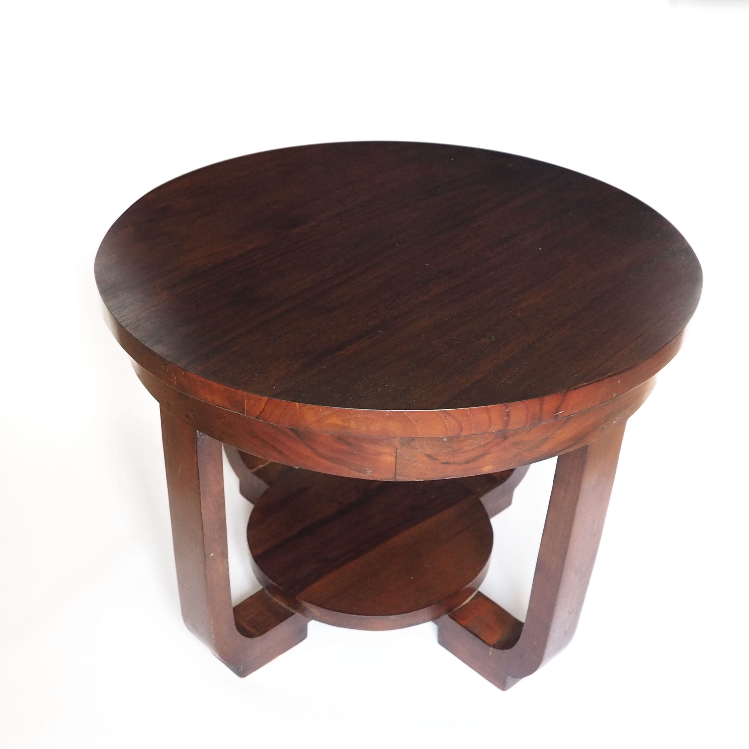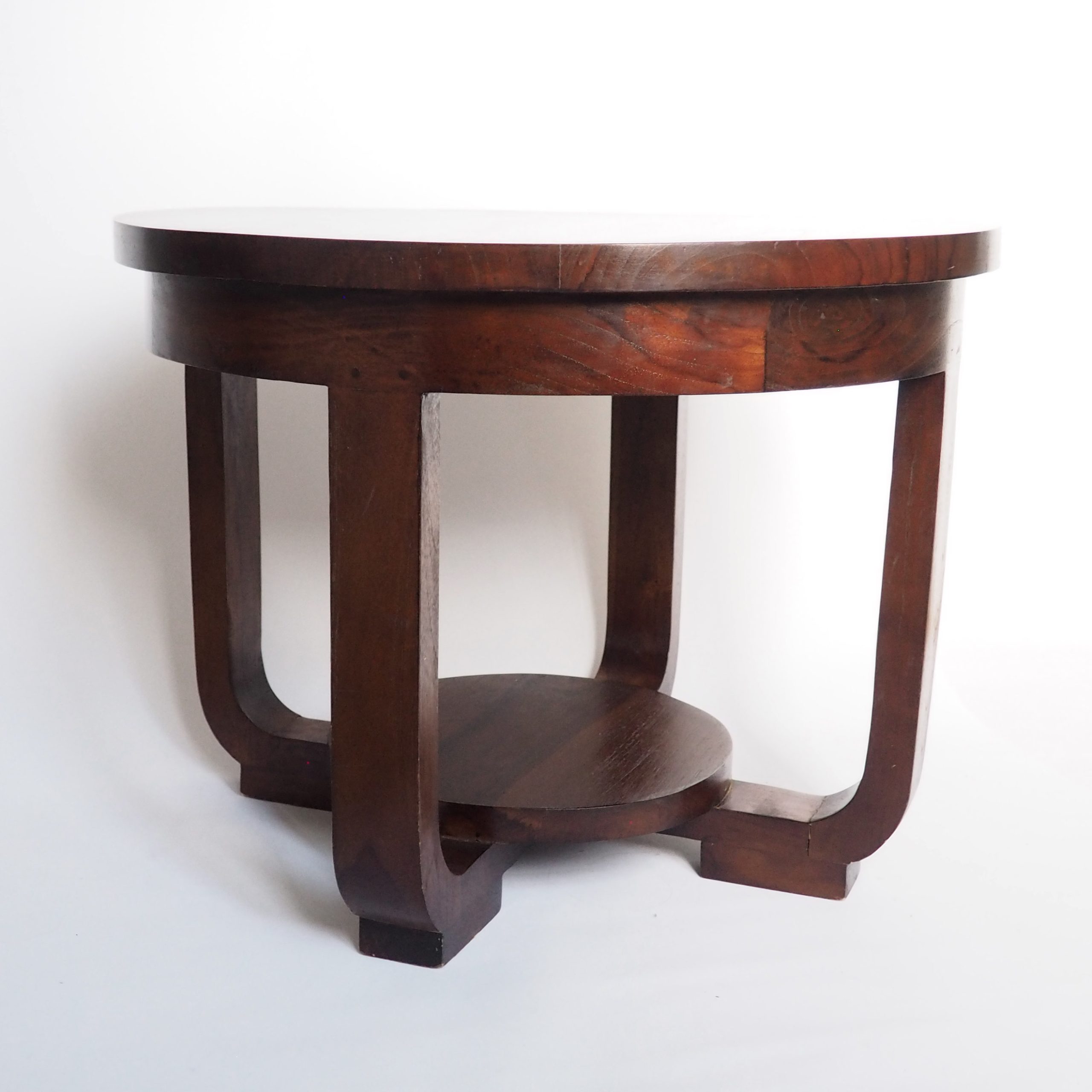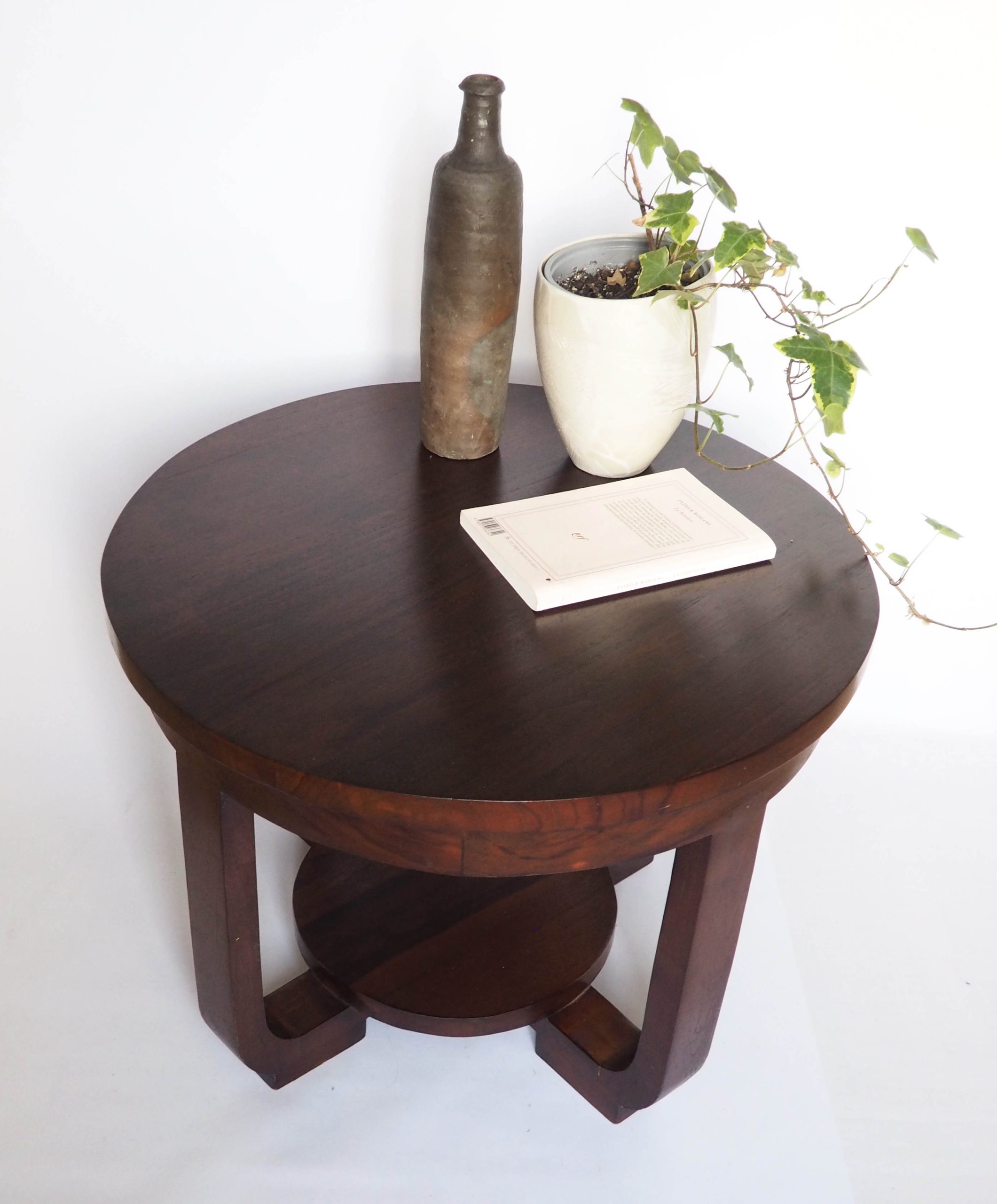 Très belle table basse ronde art déco. Joli piètement galbé et belle entretoise, bois massif, en excellent état, elle s’est refait faire une beauté par un menuisier. Elle s’intègrera dans un intérieur contemporain en lui donnant une touche authentique et chic. Dimensions: diamètre 60 cm, h 44, 5 cm.