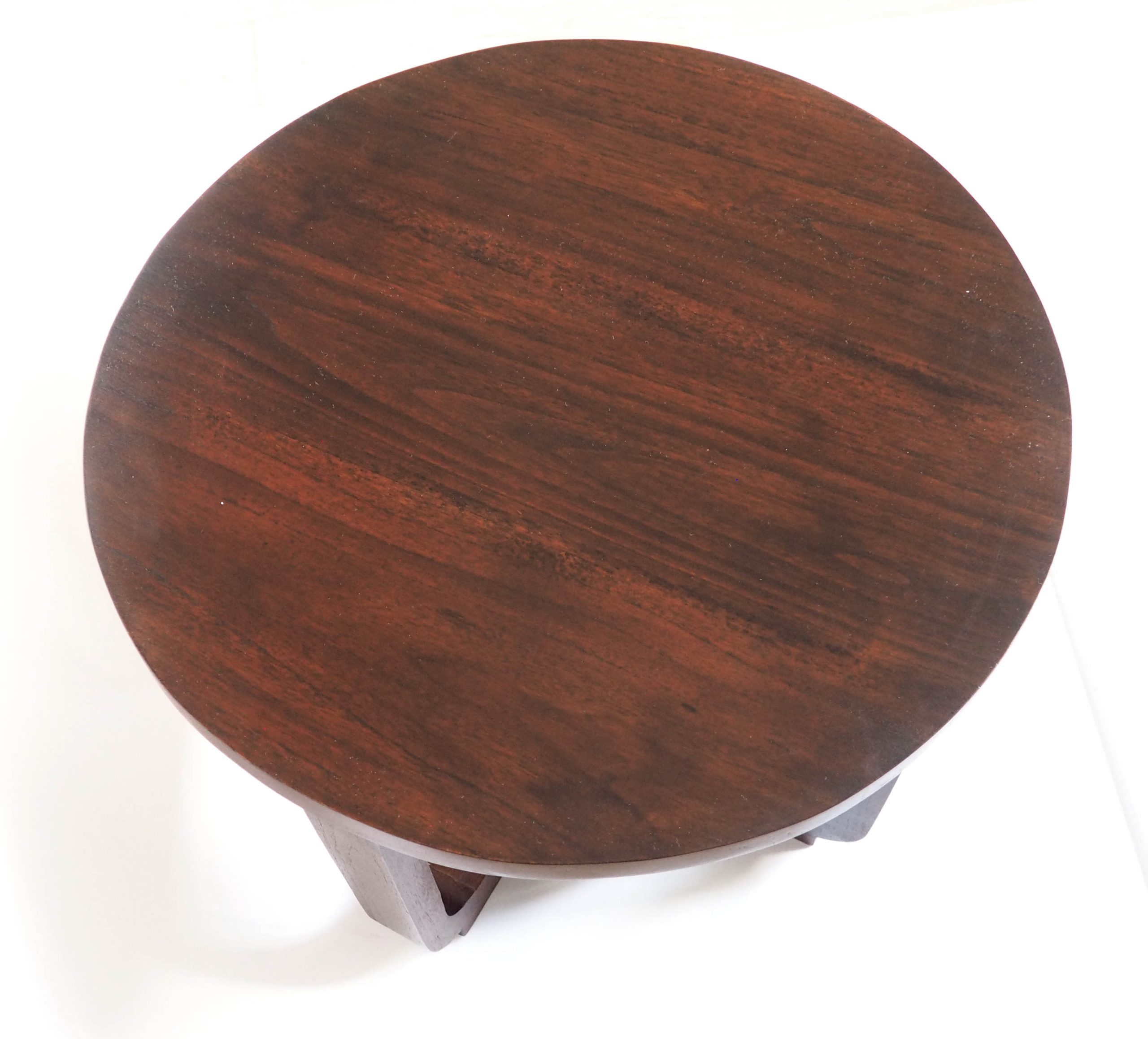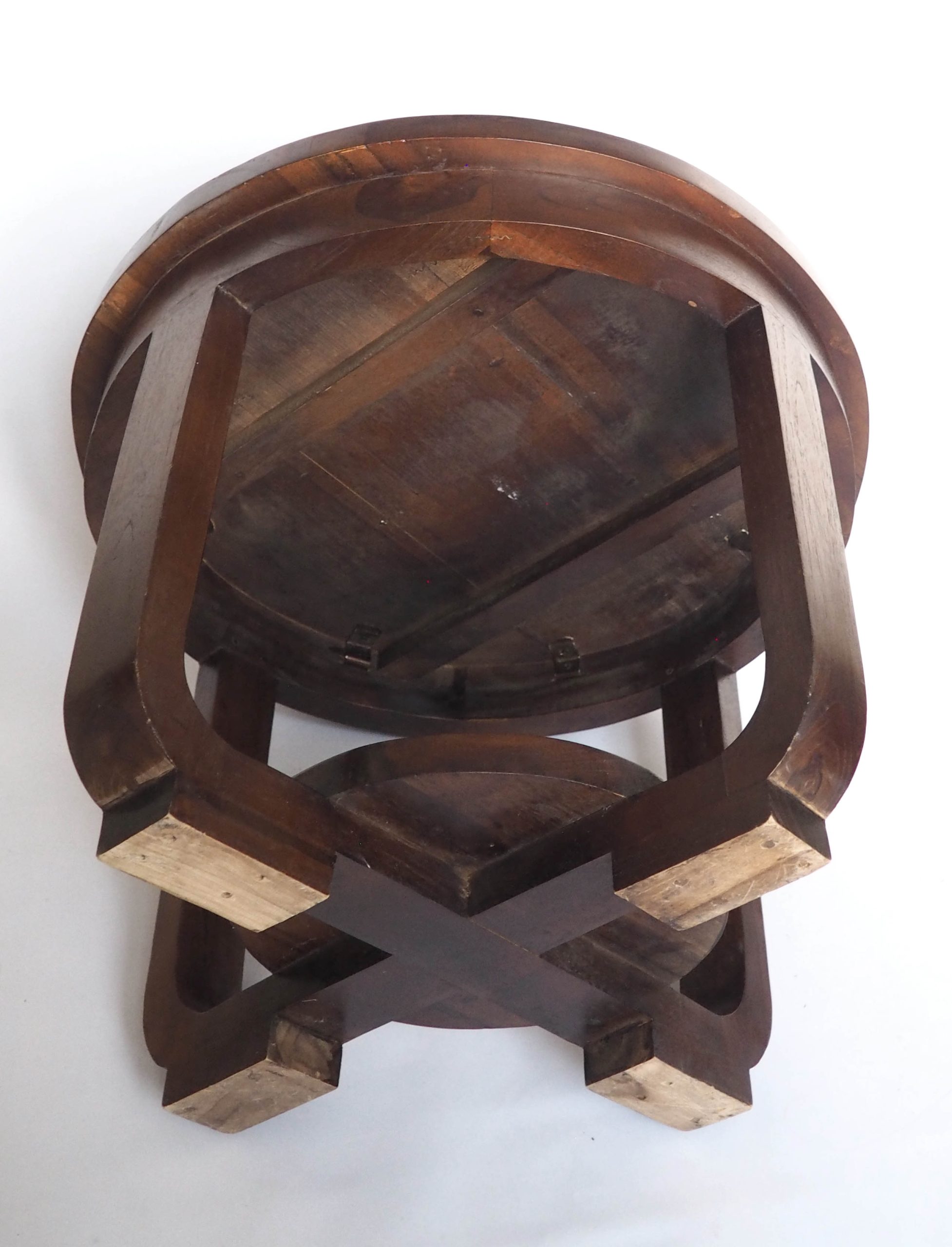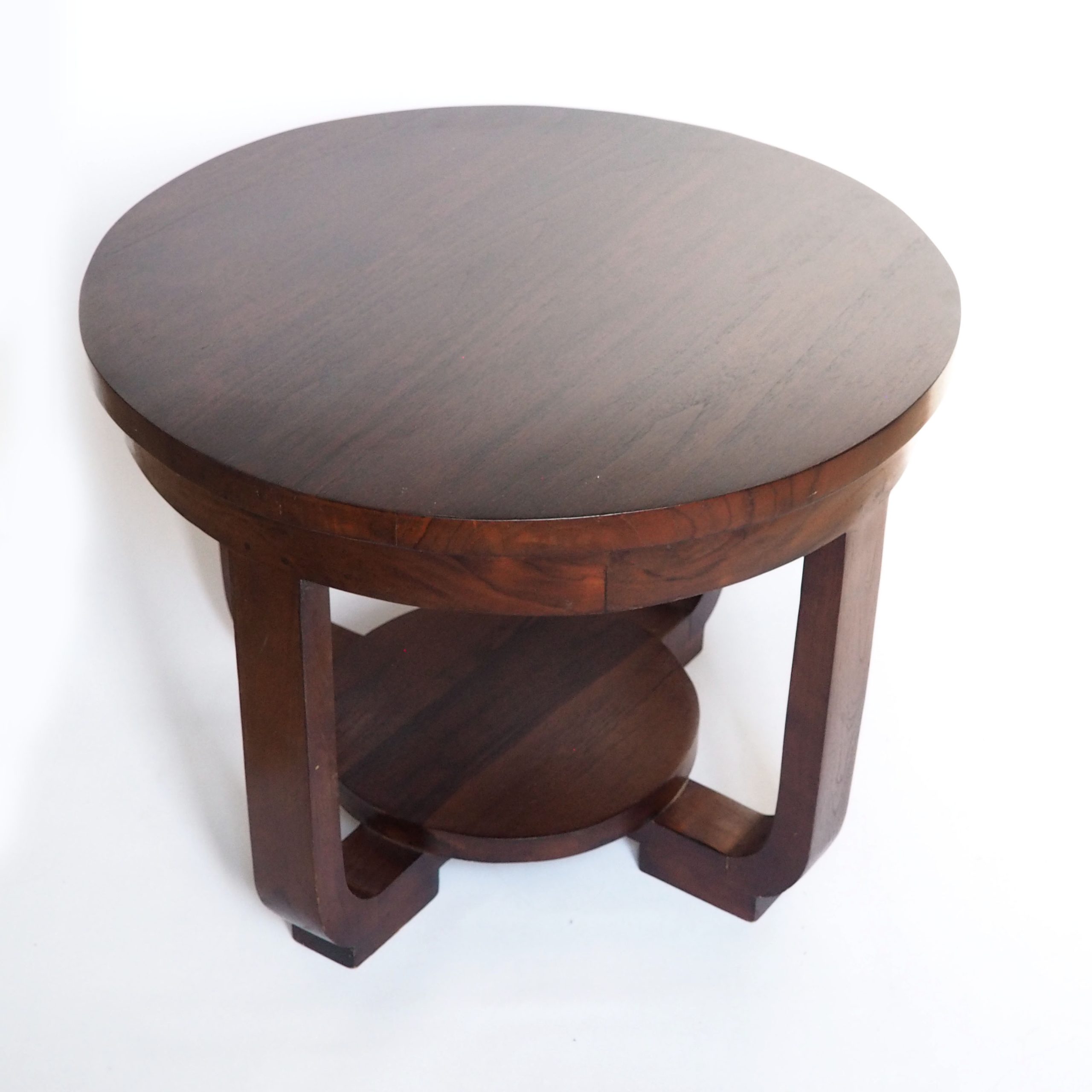 Très belle table basse ronde art déco. Joli piètement galbé et belle entretoise, bois massif, en excellent état, elle s’est refait faire une beauté par un menuisier. Elle s’intègrera dans un intérieur contemporain en lui donnant une touche authentique et chic. Dimensions: diamètre 60 cm, h 44, 5 cm.