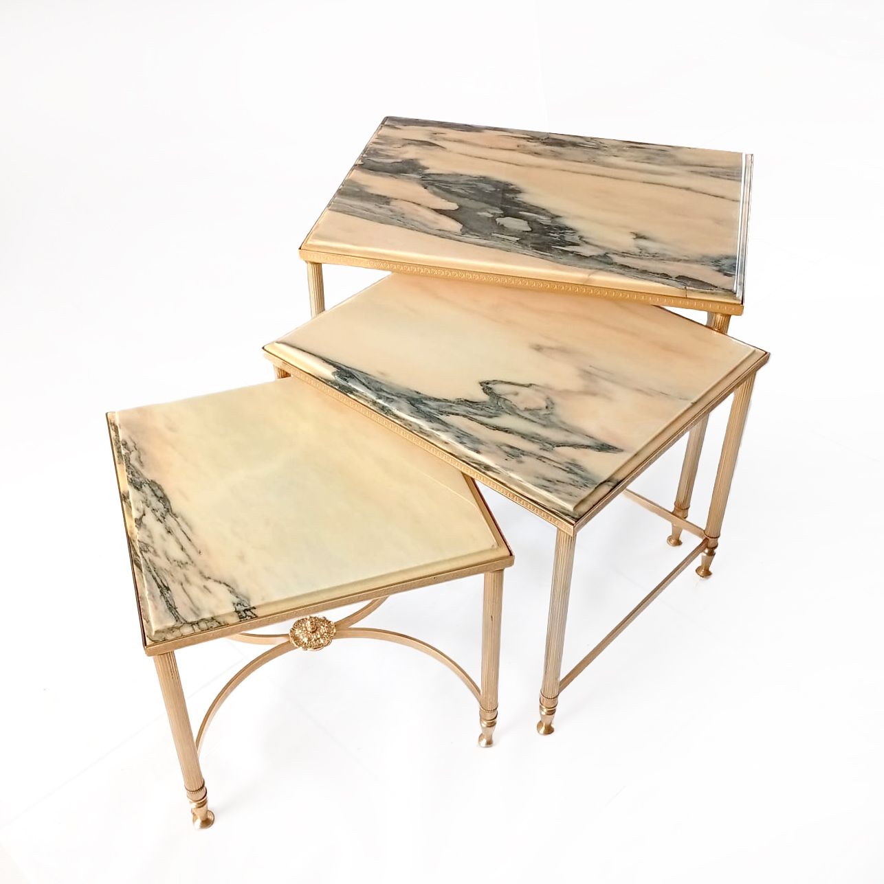 Joli ensemble de 3 tables gigognes en laiton doré et marbre. Couleur du marbre allant de l’écru vers le gris-bleu-vert profond, beau veinage. Elles s’intègreront dans un intérieur contemporain en lui donnant une touche authentique et très chic. Une fêlure est visible sur le plateau de la grande table, mise en avant sur les photos de détail (le marbre ne bouge pas dans son cadre, la fissure étant sur une partie sombre, une réparation serait possible et assez peu visible ) Dimensions de la + grande à la + petite : L 53,7 x P 39,7 x H 41 cm / L 44,7 x P 37,7 x H 37 cm / L 35,7 x P 35,5 x H 33 cm. Consultez-nous pour devis livraison selon destination.